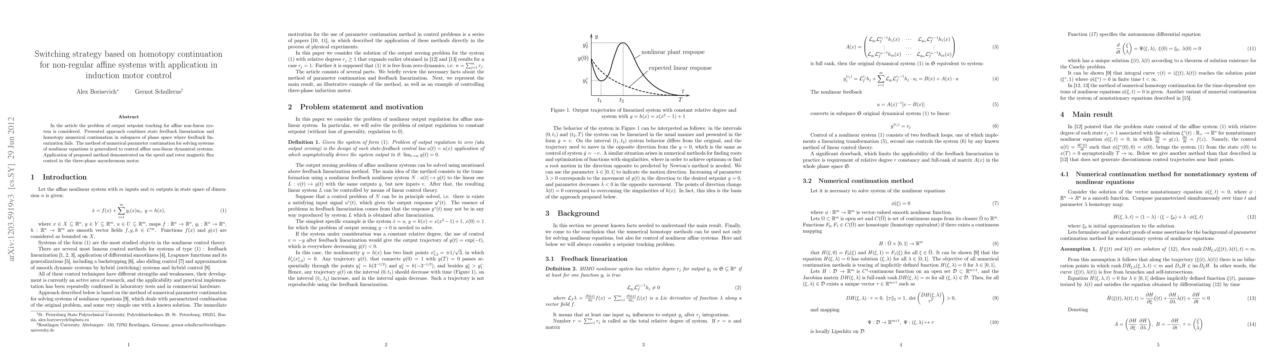 This paper proposes a switching strategy combining state feedback linearization and homotopy continuation for controlling affine non-regular systems, specifically applied to induction motor control. The method effectively handles non-linear systems where traditional linearization fails, demonstrated through the control of a three-phase asynchronous motor.