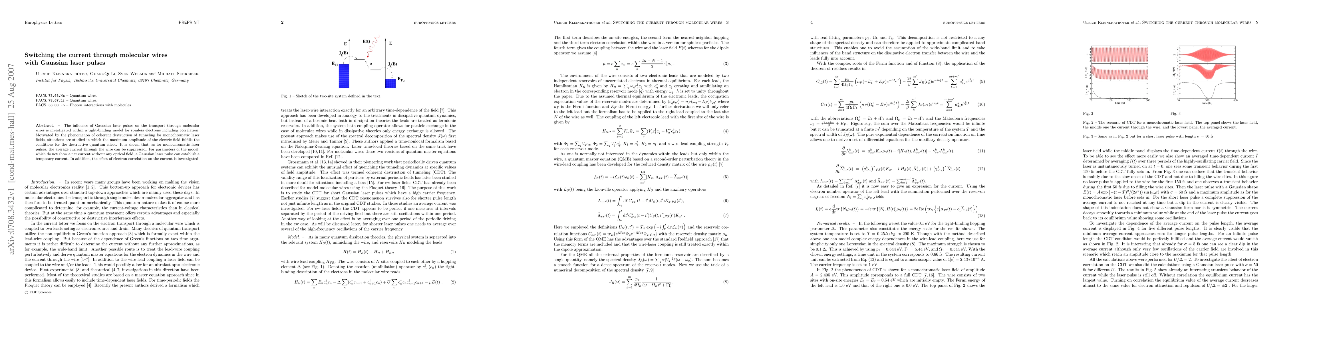 The influence of Gaussian laser pulses on the transport through molecular wires is investigated within a tight-binding model for spinless electrons including correlation. Motivated by the phenomenon of coherent destruction of tunneling for monochromatic laser fields, situations are studied in which the maximum amplitude of the electric field fulfills the conditions for the destructive quantum effect. It is shown that, as for monochromatic laser pulses, the average current through the wire can be suppressed. For parameters of the model, which do not show a net current without any optical field, a Gaussian laser pulse can establish a temporary current. In addition, the effect of electron correlation on the current is investigated.