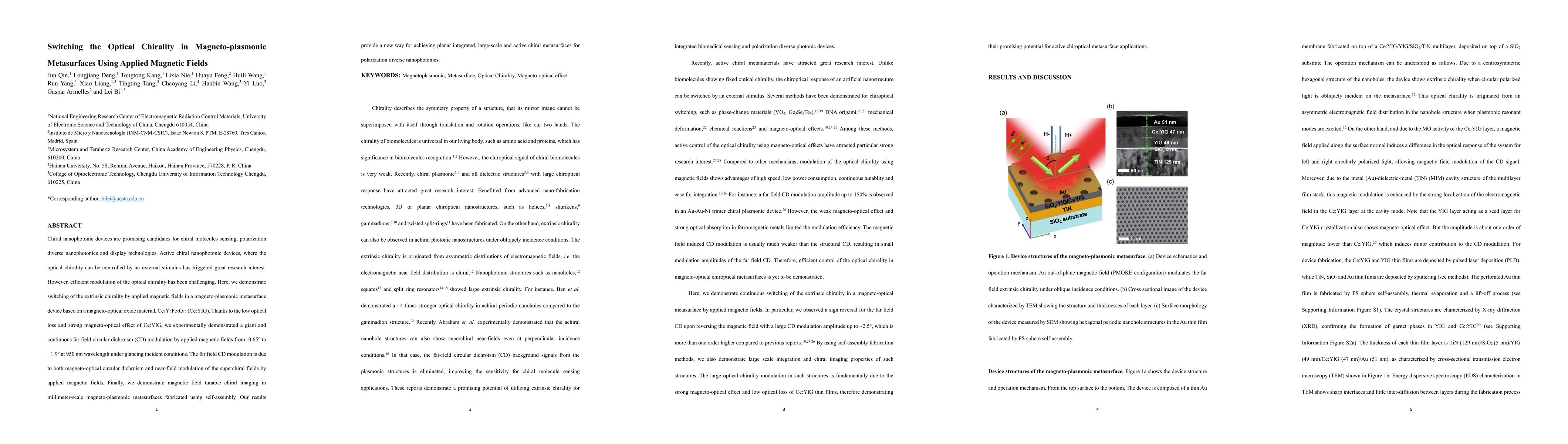 This paper demonstrates the switching of optical chirality in magneto-plasmonic metasurfaces using applied magnetic fields, specifically utilizing Ce1Y2Fe5O12 (Ce:YIG) material. The study shows significant modulation of circular dichroism via magnetic fields, paving the way for active chiral metasurfaces in nanophotonics applications.