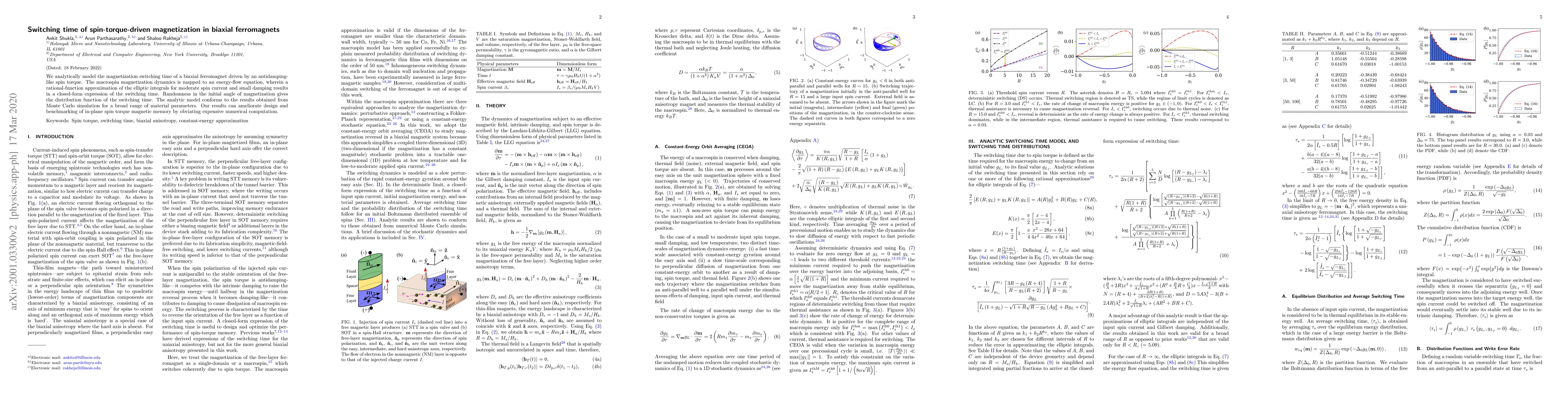 We analytically model the magnetization switching time of a biaxial ferromagnet driven by an antidamping-like spin torque. The macrospin magnetization dynamics is mapped to an energy-flow equation, wherein a rational-function approximation of the elliptic integrals for moderate spin current and small damping results in a closed-form expression of the switching time. Randomness in the initial angle of magnetization gives the distribution function of the switching time. The analytic model conforms to the results obtained from Monte Carlo simulation for a broad range of material parameters. Our results can ameliorate design and benchmarking of in-plane spin torque magnetic memory by obviating expensive numerical computation.