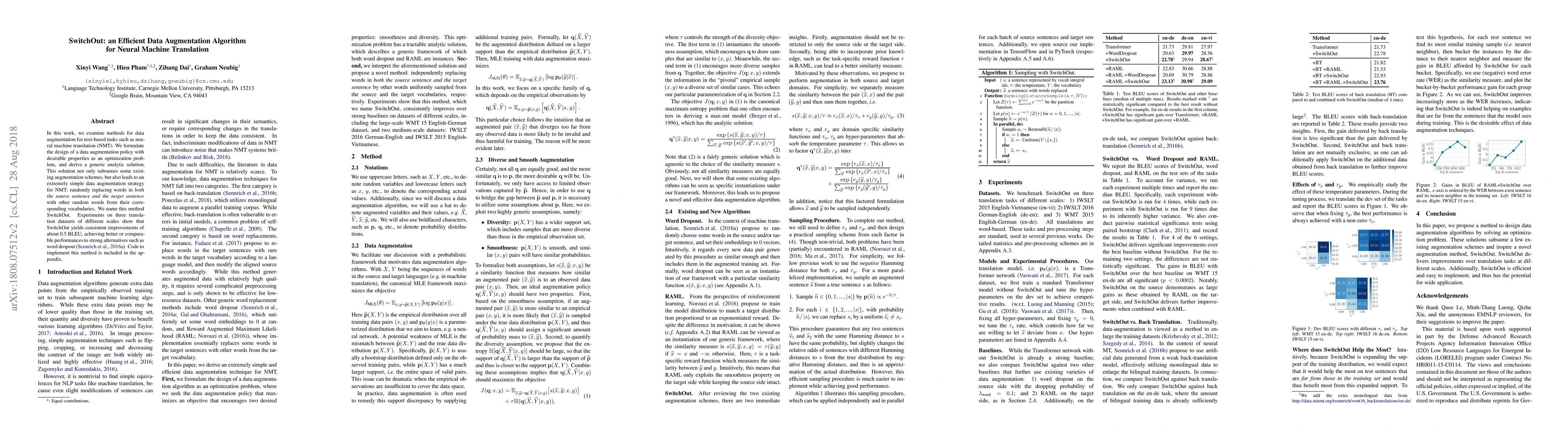 In this work, we examine methods for data augmentation for text-based tasks such as neural machine translation (NMT). We formulate the design of a data augmentation policy with desirable properties as an optimization problem, and derive a generic analytic solution. This solution not only subsumes some existing augmentation schemes, but also leads to an extremely simple data augmentation strategy for NMT: randomly replacing words in both the source sentence and the target sentence with other random words from their corresponding vocabularies. We name this method SwitchOut. Experiments on three translation datasets of different scales show that SwitchOut yields consistent improvements of about 0.5 BLEU, achieving better or comparable performances to strong alternatives such as word dropout (Sennrich et al., 2016a). Code to implement this method is included in the appendix.