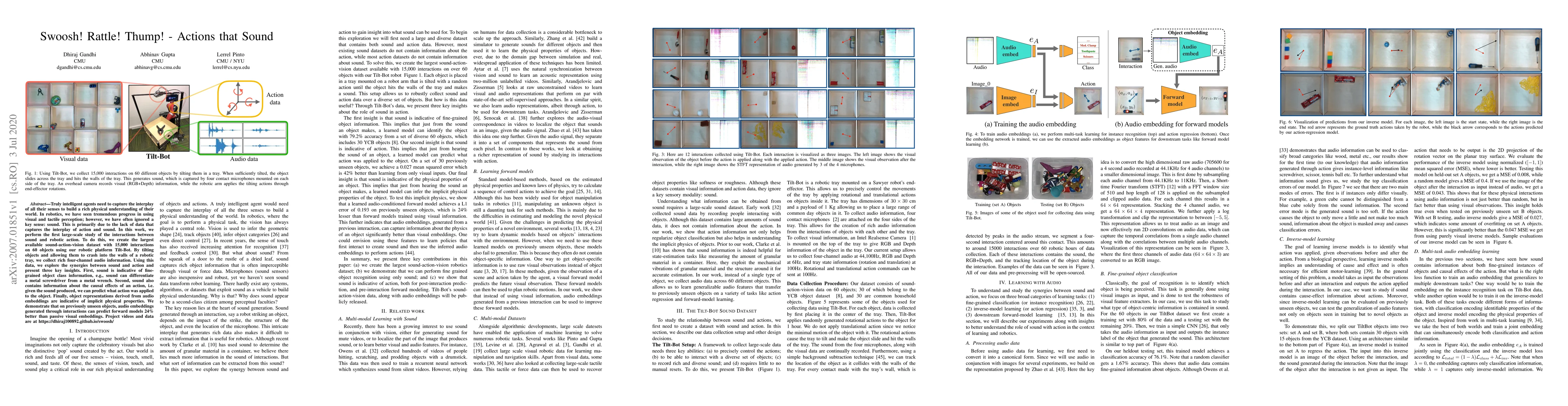 This research introduces the first extensive dataset of sound-action interactions for robots, collected via a Tilt-Bot platform. Key findings reveal that sound can distinguish object types, indicate action effects, and predict physical properties, outperforming visual embeddings in forward models by 24%.