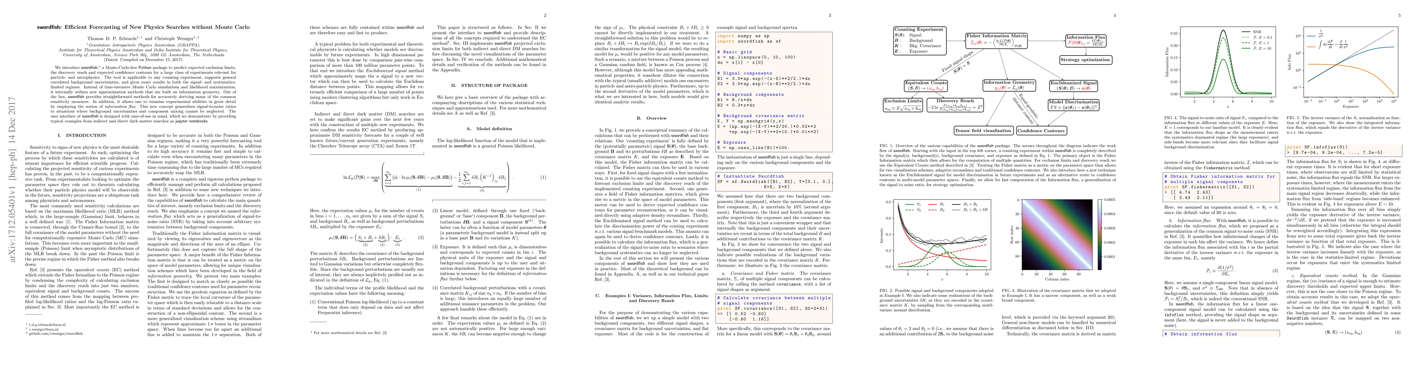 We introduce swordfish, a Monte-Carlo-free Python package to predict expected exclusion limits, the discovery reach and expected confidence contours for a large class of experiments relevant for particle- and astrophysics. The tool is applicable to any counting experiment, supports general correlated background uncertainties, and gives exact results in both the signal- and systematics-limited regimes. Instead of time-intensive Monte Carlo simulations and likelihood maximization, it internally utilizes new approximation methods that are built on information geometry. Out of the box, swordfish provides straightforward methods for accurately deriving many of the common sensitivity measures. In addition, it allows one to examine experimental abilities in great detail by employing the notion of information flux. This new concept generalizes signal-to-noise ratios to situations where background uncertainties and component mixing cannot be neglected. The user interface of swordfish is designed with ease-of-use in mind, which we demonstrate by providing typical examples from indirect and direct dark matter searches as jupyter notebooks.