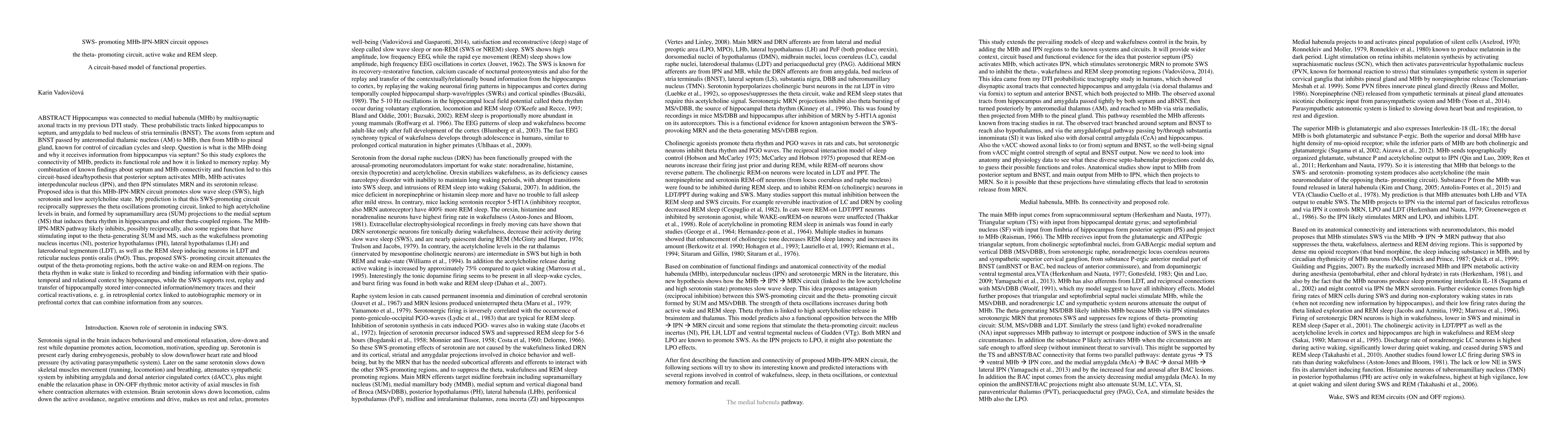 Hippocampus was by multisynaptic axonal tracts linked to medial habenula in my DTI study. These tracts linked hippocampus to septum, and amygdala to BNST. Septal and BNST axons passed by anteromedial thalamic nucleus to MHb, which projected to pineal gland. Question is what is the MHb doing and why it receives information from hippocampus via septum? This study explores the MHb connectivity, predicts its functional role and how it is linked to memory. Combination of known findings about the septum and MHb connectivity and function led to this circuit-based idea that posterior septum activates MHb, MHb activates IPN,and IPN stimulates MRN and its serotonin release. Proposed idea is that this MHb-IPN-MRN circuit promotes slow wave sleep (SWS), high serotonin and low acetylcholine state. My prediction is that this SWS-promoting circuit reciprocally suppresses the theta oscillations promoting circuit, linked to high acetylcholine levels in brain, and formed by supramamillary area projections to the medial septum (MS) that induces theta rhythm in hippocampus and other theta-coupled regions. The MHb-IPN-MRN pathway likely inhibits, possibly reciprocally,some regions that have stimulating input to the theta-generating SUM and MS, such as the wake promoting nucleus incertus, posterior and lateral hypothalamus and LDT, but also the REM sleep inducing neurons in LDT and PnO. Thus, proposed SWS- promoting circuit attenuates the output of theta-promoting regions, both the active wake-on and REM-on regions. The theta rhythm in wake state is linked to recording and binding information with their spatio-temporal and relational context by hippocampus, while the SWS supports rest and replay of hippocampaly stored information and their cortical reactivations, e. g. in retrosplenial cortex linked to autobiographic memory or in prefrontal cortex that can combine information from any source.