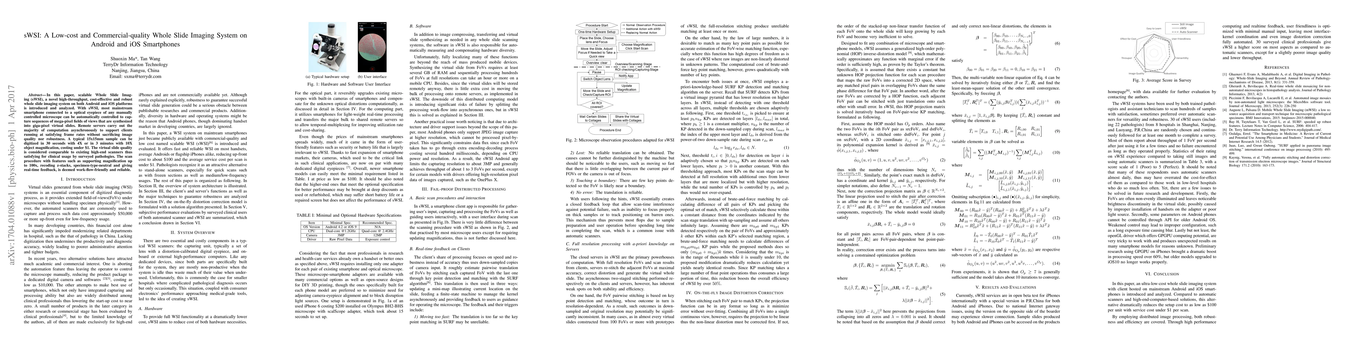 This paper introduces sWSI, a cost-effective whole slide imaging system for Android and iOS smartphones, enabling high-quality digitization of pathology samples at low cost. The system leverages remote servers to maintain high frame rates and image quality, with 15x15mm samples digitized in minutes, comparable to high-end scanners.