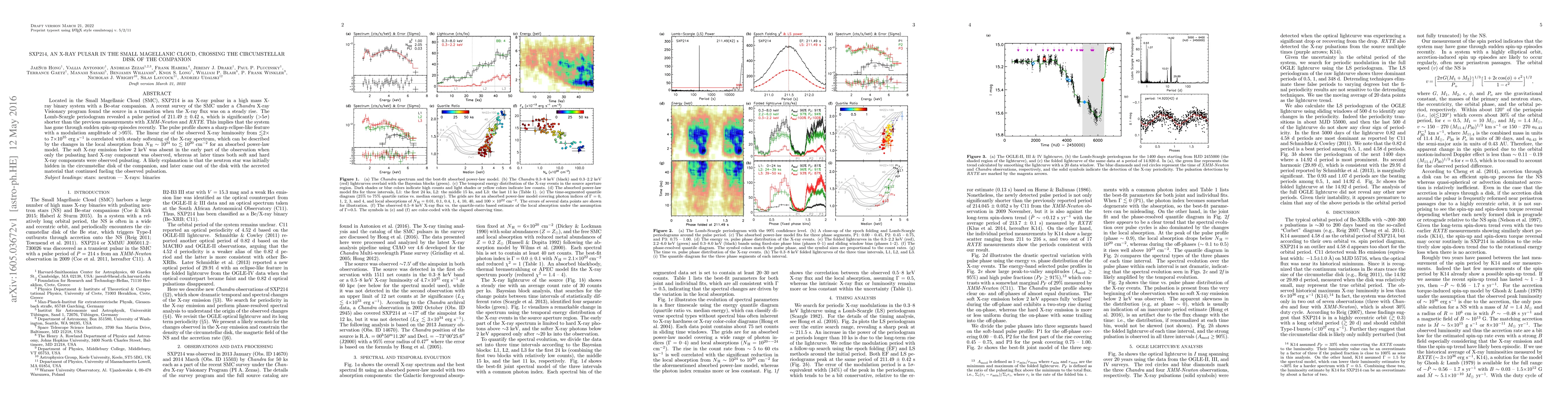 Located in the Small Magellanic Cloud (SMC), SXP214 is an X-ray pulsar in a high mass X-ray binary system with a Be-star companion. A recent survey of the SMC under a Chandra X-ray Visionary program found the source in a transition when the X-ray flux was on a steady rise. The Lomb-Scargle periodogram revealed a pulse period of 211.49 +/- 0.42 s, which is significantly (>5sigma) shorter than the previous measurements with XMM-Newton and RXTE. This implies that the system has gone through sudden spin-up episodes recently. The pulse profile shows a sharp eclipse-like feature with a modulation amplitude of >95%. The linear rise of the observed X-ray luminosity from <~2x to 7x10^35 erg s^-1 is correlated with steady softening of the X-ray spectrum, which can be described by the changes in the local absorption from N_H ~ 10^24 to <~10^20 cm^-2 for an absorbed power-law model. The soft X-ray emission below 2 keV was absent in the early part of the observation when only the pulsating hard X-ray component was observed, whereas at later times both soft and hard X-ray components were observed pulsating. A likely explanation is that the neutron star was initially hidden in the circumstellar disk of the companion, and later came out of the disk with the accreted material that continued fueling the observed pulsation.
