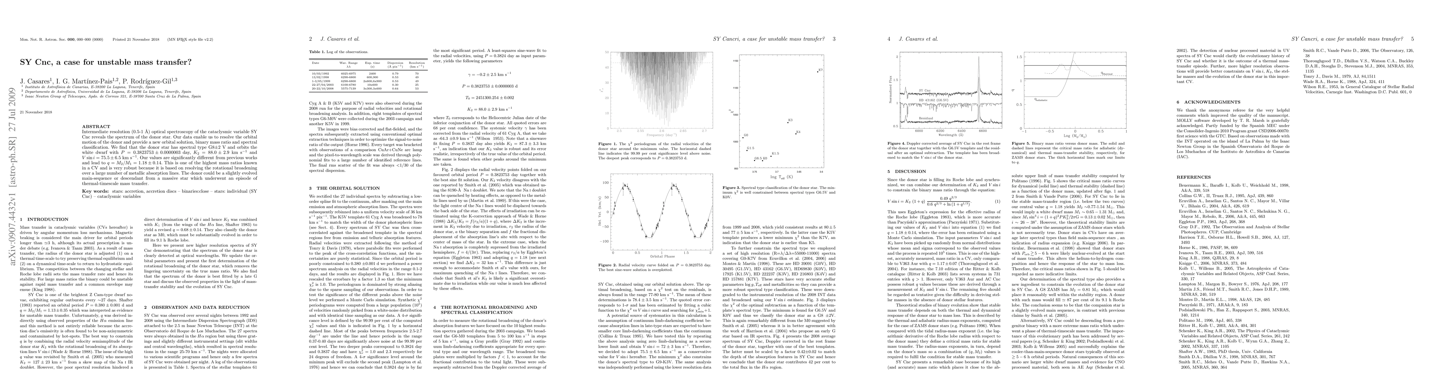 Intermediate resolution (0.5-1 Angs) optical spectroscopy of the cataclysmic variable SY Cnc reveals the spectrum of the donor star. Our data enable us to resolve the orbital motion of the donor and provide a new orbital solution, binary mass ratio and spectral classification. We find that the donor star has spectral type G8+-2 V and orbits the white dwarf with P=0.3823753 +- 0.0000003 day, K2=88.0 +-2.9 km/s and V sin i=75.5 +- 6.5 km/s. Our values are significantly different from previous works and lead to q=M2/M1=1.18 +- 0.14. This is one of the highest mass ratios known in a CV and is very robust because it is based on resolving the rotational broadening over a large number of metallic absorption lines. The donor could be a slightly evolved main-sequence or descendant from a massive star which underwent an episode of thermal-timescale mass transfer.