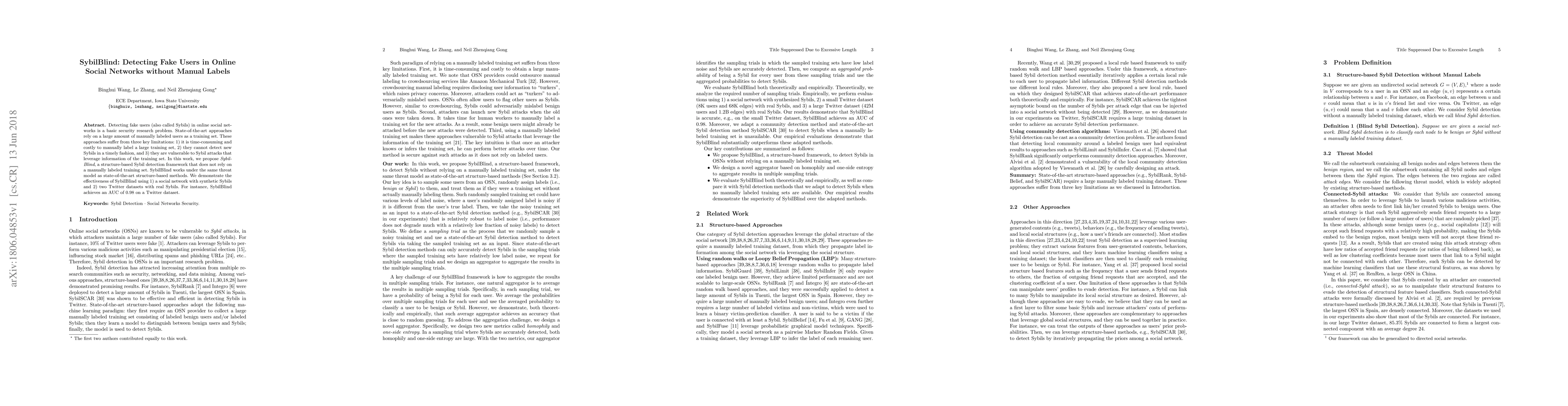 Detecting fake users (also called Sybils) in online social networks is a basic security research problem. State-of-the-art approaches rely on a large amount of manually labeled users as a training set. These approaches suffer from three key limitations: 1) it is time-consuming and costly to manually label a large training set, 2) they cannot detect new Sybils in a timely fashion, and 3) they are vulnerable to Sybil attacks that leverage information of the training set. In this work, we propose SybilBlind, a structure-based Sybil detection framework that does not rely on a manually labeled training set. SybilBlind works under the same threat model as state-of-the-art structure-based methods. We demonstrate the effectiveness of SybilBlind using 1) a social network with synthetic Sybils and 2) two Twitter datasets with real Sybils. For instance, SybilBlind achieves an AUC of 0.98 on a Twitter dataset.
