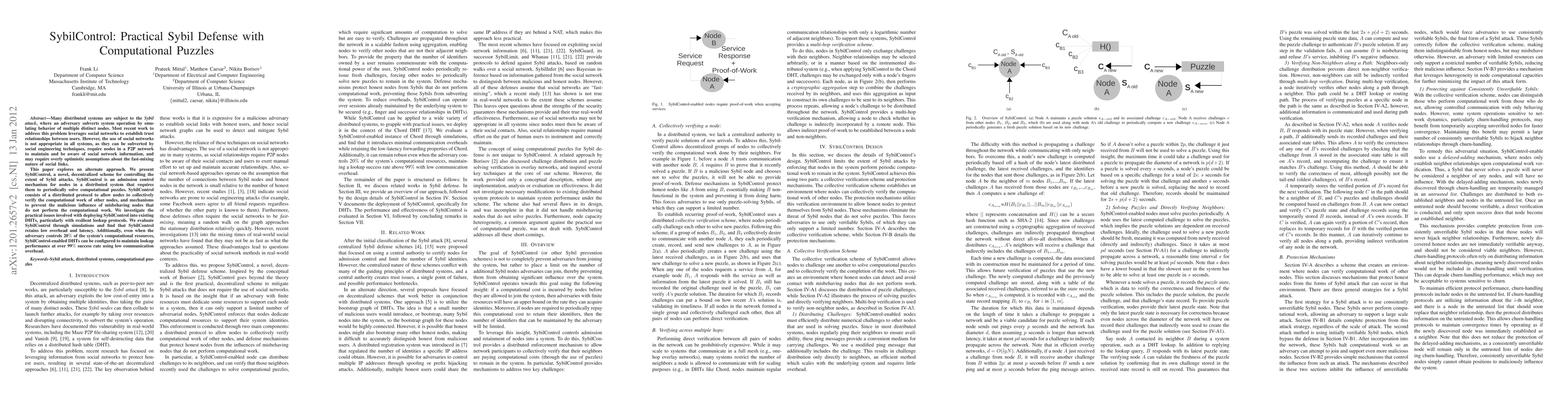 SybilControl is a decentralized scheme that uses computational puzzles to prevent Sybil attacks in distributed systems, with low overhead and latency even when adversaries control 20% of system resources.