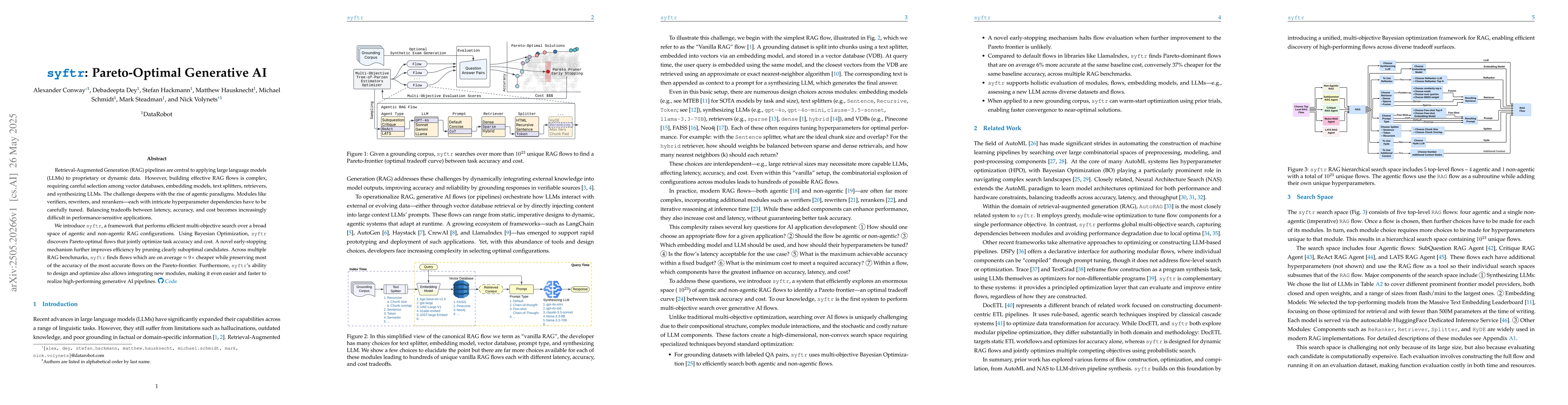 Retrieval-Augmented Generation (RAG) pipelines are central to applying large language models (LLMs) to proprietary or dynamic data. However, building effective RAG flows is complex, requiring careful selection among vector databases, embedding models, text splitters, retrievers, and synthesizing LLMs. The challenge deepens with the rise of agentic paradigms. Modules like verifiers, rewriters, and rerankers-each with intricate hyperparameter dependencies have to be carefully tuned. Balancing tradeoffs between latency, accuracy, and cost becomes increasingly difficult in performance-sensitive applications. We introduce syftr, a framework that performs efficient multi-objective search over a broad space of agentic and non-agentic RAG configurations. Using Bayesian Optimization, syftr discovers Pareto-optimal flows that jointly optimize task accuracy and cost. A novel early-stopping mechanism further improves efficiency by pruning clearly suboptimal candidates. Across multiple RAG benchmarks, syftr finds flows which are on average approximately 9 times cheaper while preserving most of the accuracy of the most accurate flows on the Pareto-frontier. Furthermore, syftr's ability to design and optimize allows integrating new modules, making it even easier and faster to realize high-performing generative AI pipelines.