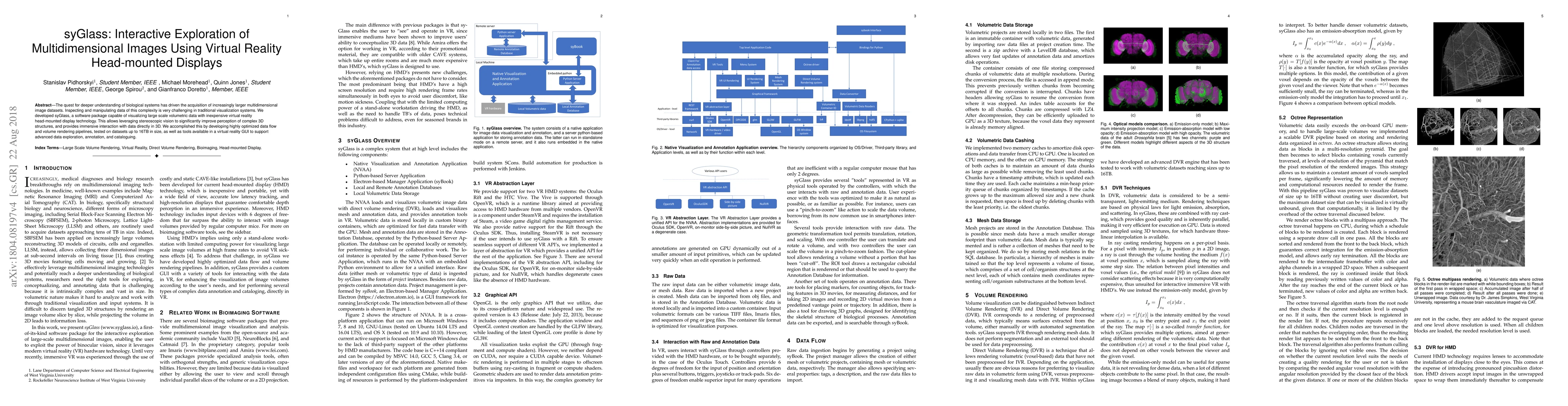 syGlass is a software package for visualizing large volumetric datasets using virtual reality head-mounted displays, enabling immersive 3D exploration and interaction. It features optimized rendering pipelines and a VR GUI for advanced data manipulation and annotation.