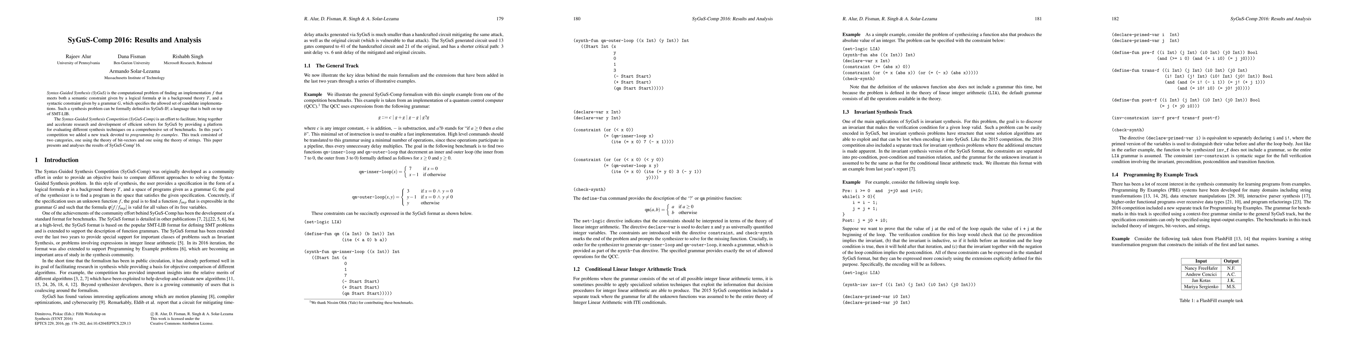 Syntax-Guided Synthesis (SyGuS) is the computational problem of finding an implementation f that meets both a semantic constraint given by a logical formula $\varphi$ in a background theory T, and a syntactic constraint given by a grammar G, which specifies the allowed set of candidate implementations. Such a synthesis problem can be formally defined in SyGuS-IF, a language that is built on top of SMT-LIB. The Syntax-Guided Synthesis Competition (SyGuS-Comp) is an effort to facilitate, bring together and accelerate research and development of efficient solvers for SyGuS by providing a platform for evaluating different synthesis techniques on a comprehensive set of benchmarks. In this year's competition we added a new track devoted to programming by examples. This track consisted of two categories, one using the theory of bit-vectors and one using the theory of strings. This paper presents and analyses the results of SyGuS-Comp'16.