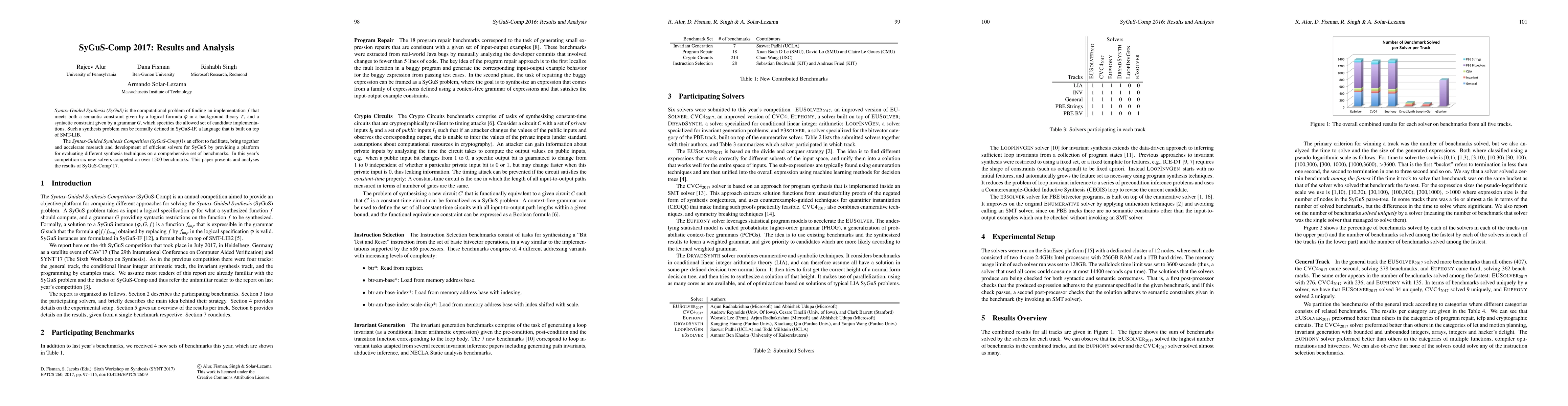 Syntax-Guided Synthesis (SyGuS) is the computational problem of finding an implementation f that meets both a semantic constraint given by a logical formula phi in a background theory T, and a syntactic constraint given by a grammar G, which specifies the allowed set of candidate implementations. Such a synthesis problem can be formally defined in SyGuS-IF, a language that is built on top of SMT-LIB. The Syntax-Guided Synthesis Competition (SyGuS-Comp) is an effort to facilitate, bring together and accelerate research and development of efficient solvers for SyGuS by providing a platform for evaluating different synthesis techniques on a comprehensive set of benchmarks. In this year's competition six new solvers competed on over 1500 benchmarks. This paper presents and analyses the results of SyGuS-Comp'17.