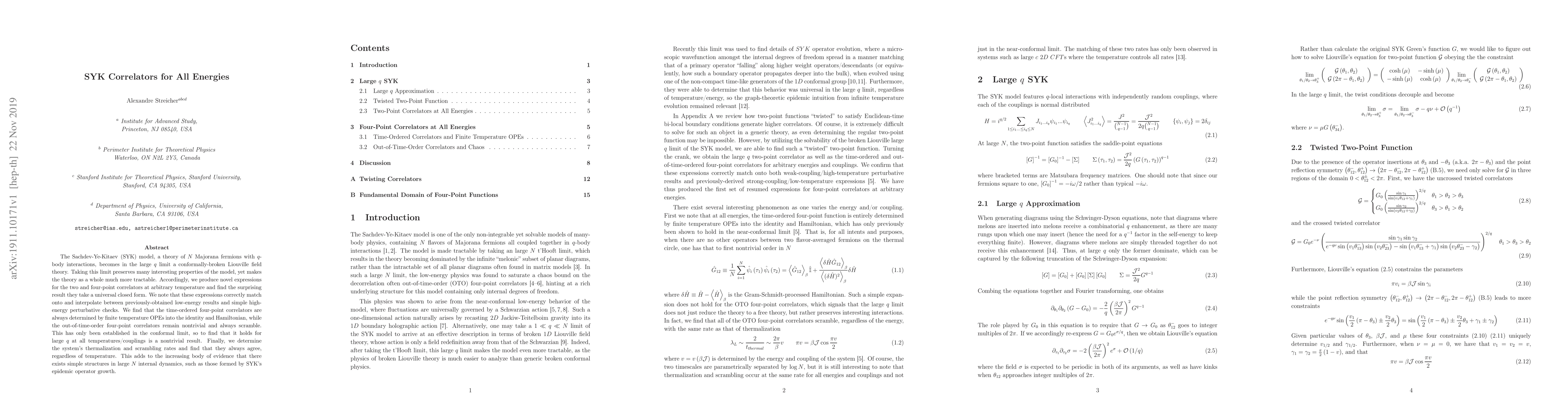 The Sachdev-Ye-Kitaev (SYK) model, a theory of N Majorana fermions with q-body interactions, becomes in the large q limit a conformally-broken Liouville field theory. Taking this limit preserves many interesting properties of the model, yet makes the theory as a whole much more tractable. Accordingly, we produce novel expressions for the two and four-point correlators at arbitrary temperature and find the surprising result they take a universal closed form. We note that these expressions correctly match onto and interpolate between previously-obtained low-energy results and simple high-energy perturbative checks. We find that the time-ordered four-point correlators are always determined by finite temperature OPEs into the identity and Hamiltonian, while the out-of-time-order four-point correlators remain nontrivial and always scramble. This has only been established in the conformal limit, so to find that it holds for large q at all temperatures/couplings is a nontrivial result. Finally, we determine the system's thermalization and scrambling rates and find that they always agree, regardless of temperature. This adds to the increasing body of evidence that there exists simple structures in large N internal dynamics, such as those formed by SYK's epidemic operator growth.