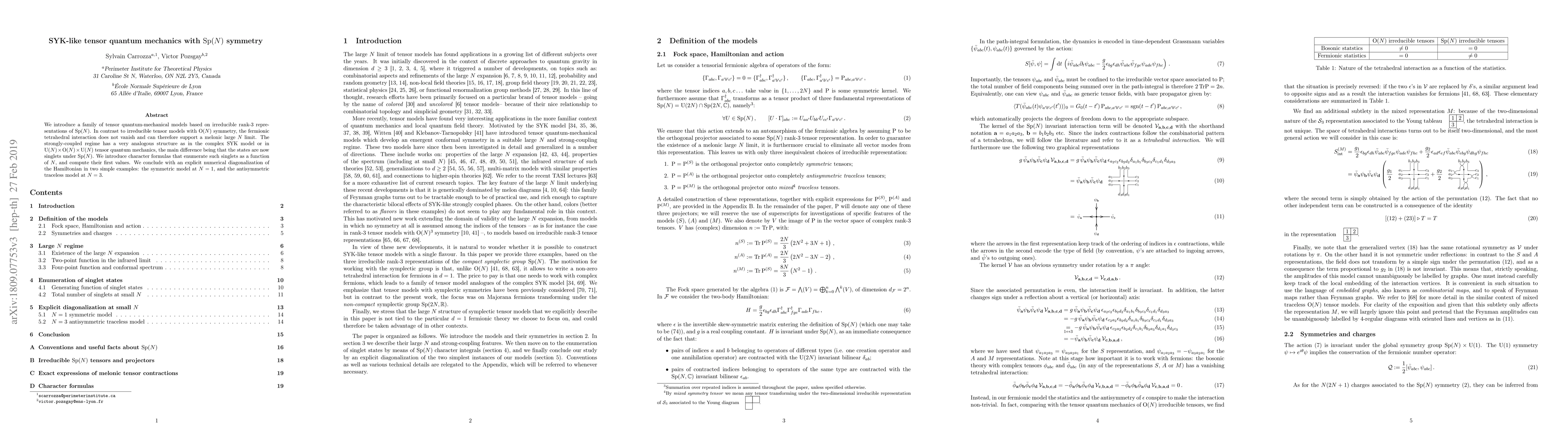 We introduce a family of tensor quantum-mechanical models based on irreducible rank-$3$ representations of $\mathrm{Sp}(N)$. In contrast to irreducible tensor models with $\mathrm{O}(N)$ symmetry, the fermionic tetrahedral interaction does not vanish and can therefore support a melonic large $N$ limit. The strongly-coupled regime has a very analogous structure as in the complex SYK model or in $\mathrm{U}(N)\times\mathrm{O}(N)\times\mathrm{U}(N)$ tensor quantum mechanics, the main difference being that the states are now singlets under $\mathrm{Sp}(N)$. We introduce character formulas that enumerate such singlets as a function of $N$, and compute their first values. We conclude with an explicit numerical diagonalization of the Hamiltonian in two simple examples: the symmetric model at $N=1$, and the antisymmetric traceless model at $N=3$.
