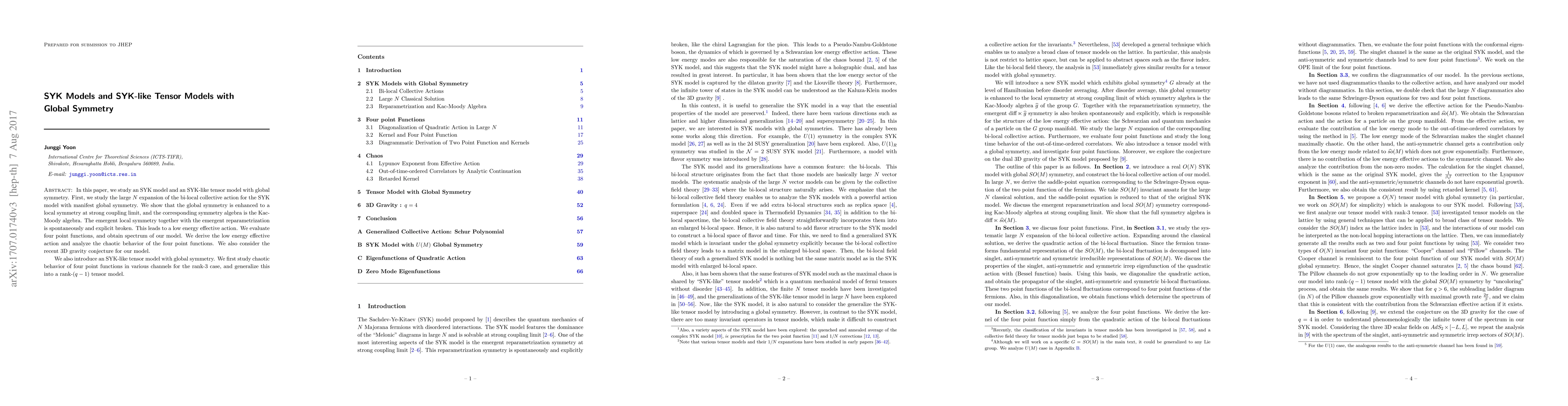 This paper explores SYK models and SYK-like tensor models with global symmetry, demonstrating that the global symmetry enhances to a local symmetry in the strong coupling limit, leading to a low energy effective action. It also introduces an SYK-like tensor model, analyzing its chaotic behavior and generalizing it to higher ranks.