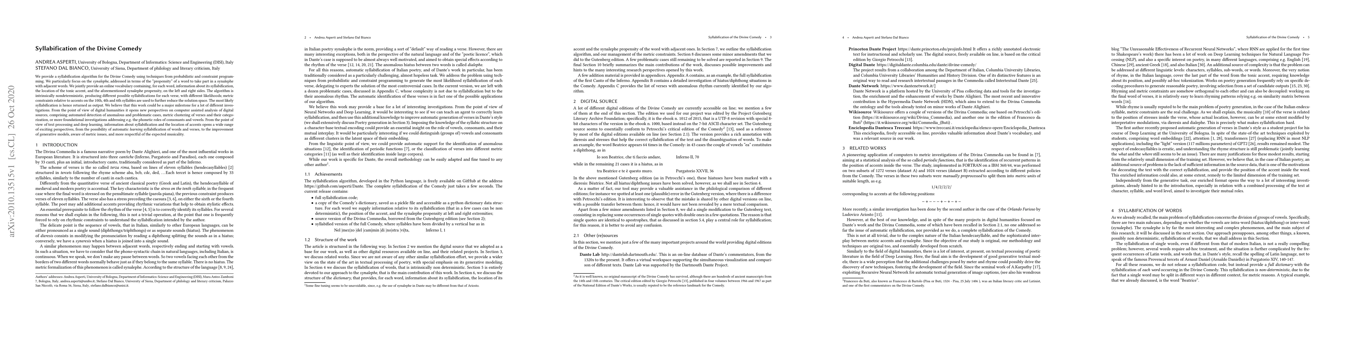 This paper presents an algorithm for syllabifying Dante's Divine Comedy using probabilistic and constraint programming, focusing on synalephe. The algorithm generates multiple syllabifications with likelihoods, reducing options with metric constraints, and aims to advance digital humanities and text processing.