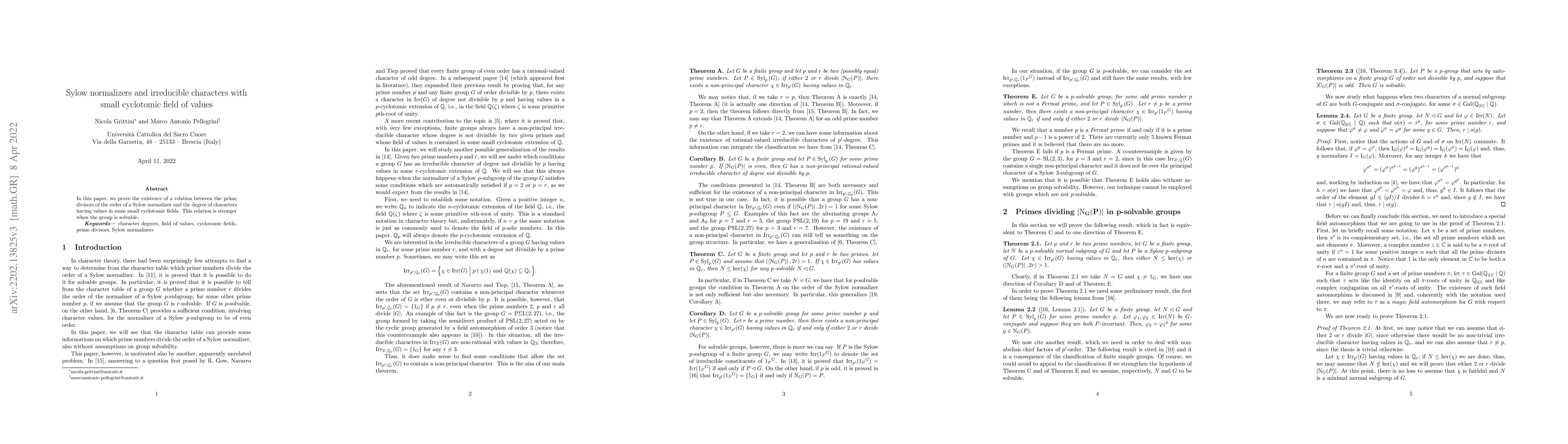The paper establishes a connection between Sylow normalizers and irreducible characters with small cyclotomic field values, particularly in solvable groups, showing a relationship between prime divisors of the order of Sylow normalizers and character degrees.