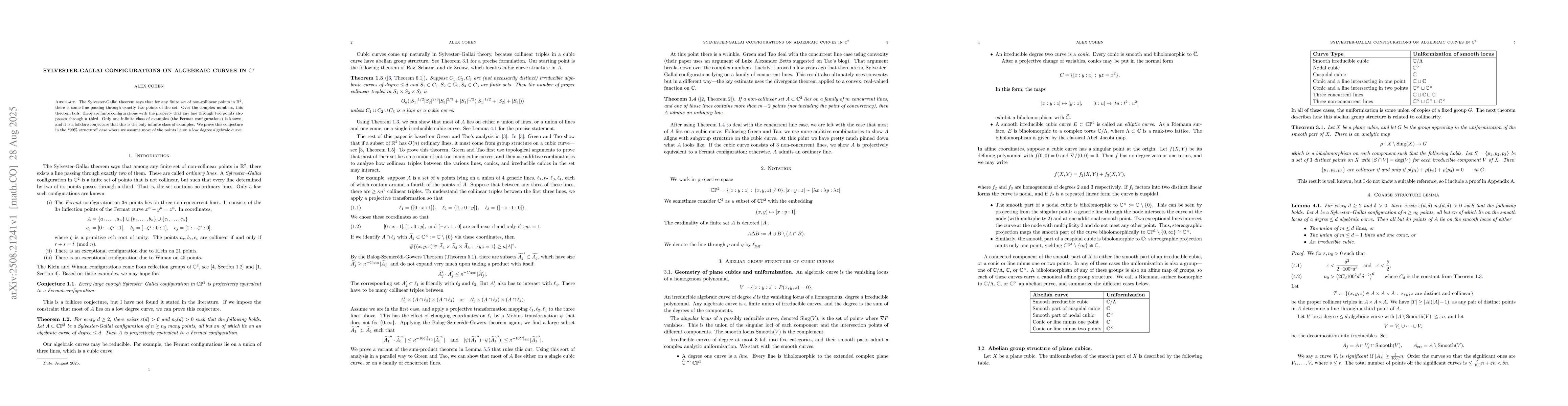 The Sylvester-Gallai theorem says that for any finite set of non-collinear points in $\R^2$, there is some line passing through exactly two points of the set. Over the complex numbers, this theorem fails: there are finite configurations with the property that any line through two points also passes through a third. Only one infinite class of examples (the Fermat configurations) is known, and it is a folklore conjecture that this is the only infinite class of examples. We prove this conjecture in the ``99\% structure'' case where we assume most of the points lie on a low degree algebraic curve.