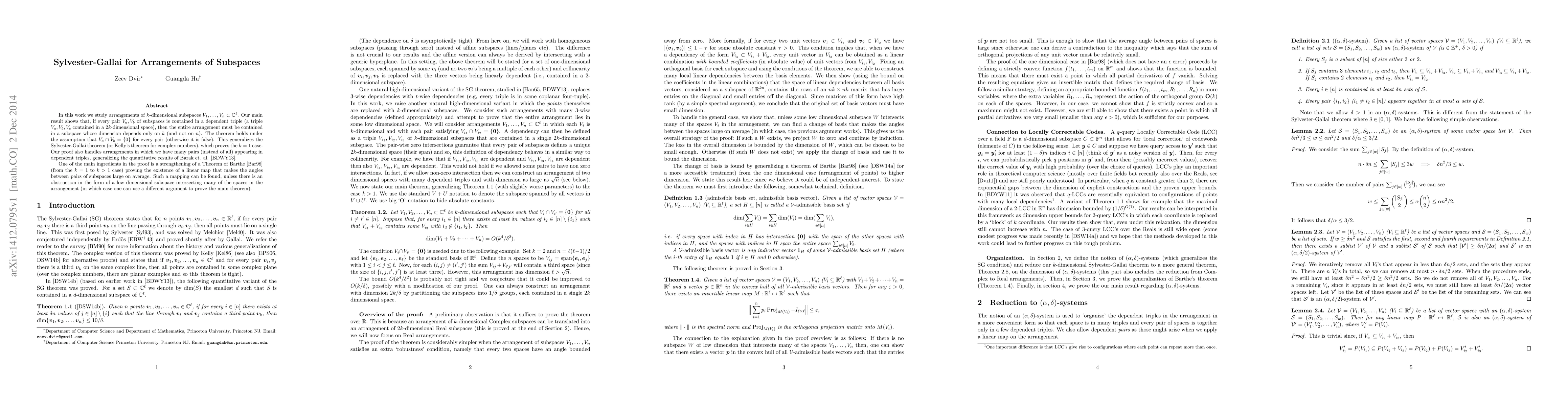 In this work we study arrangements of $k$-dimensional subspaces $V_1,\ldots,V_n \subset \mathbb{C}^\ell$. Our main result shows that, if every pair $V_{a},V_b$ of subspaces is contained in a dependent triple (a triple $V_{a},V_b,V_c$ contained in a $2k$-dimensional space), then the entire arrangement must be contained in a subspace whose dimension depends only on $k$ (and not on $n$). The theorem holds under the assumption that $V_a \cap V_b = \{0\}$ for every pair (otherwise it is false). This generalizes the Sylvester-Gallai theorem (or Kelly's theorem for complex numbers), which proves the $k=1$ case. Our proof also handles arrangements in which we have many pairs (instead of all) appearing in dependent triples, generalizing the quantitative results of Barak et. al. [BDWY-pnas]. One of the main ingredients in the proof is a strengthening of a Theorem of Barthe [Bar98] (from the $k=1$ to $k>1$ case) proving the existence of a linear map that makes the angles between pairs of subspaces large on average. Such a mapping can be found, unless there is an obstruction in the form of a low dimensional subspace intersecting many of the spaces in the arrangement (in which case one can use a different argument to prove the main theorem).