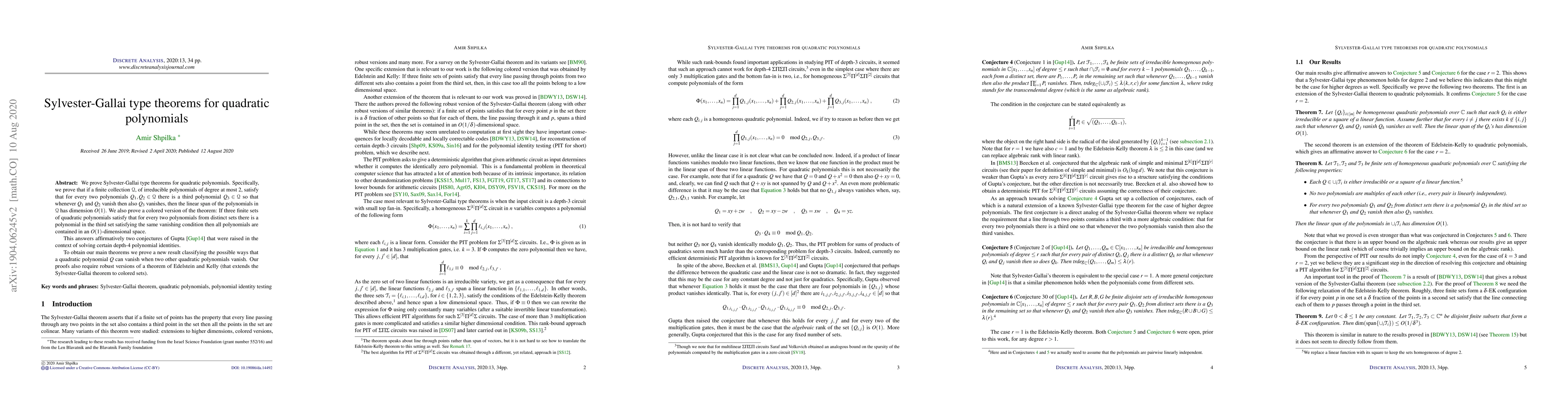 We prove Sylvester-Gallai type theorems for quadratic polynomials. Specifically, we prove that if a finite collection $\mathcal Q$, of irreducible polynomials of degree at most $2$, satisfy that for every two polynomials $Q_1,Q_2\in {\mathcal Q}$ there is a third polynomial $Q_3\in{\mathcal Q}$ so that whenever $Q_1$ and $Q_2$ vanish then also $Q_3$ vanishes, then the linear span of the polynomials in ${\mathcal Q}$ has dimension $O(1)$. We also prove a colored version of the theorem: If three finite sets of quadratic polynomials satisfy that for every two polynomials from distinct sets there is a polynomial in the third set satisfying the same vanishing condition then all polynomials are contained in an $O(1)$-dimensional space. This answers affirmatively two conjectures of Gupta [ECCC 2014] that were raised in the context of solving certain depth-$4$ polynomial identities. To obtain our main theorems we prove a new result classifying the possible ways that a quadratic polynomial $Q$ can vanish when two other quadratic polynomials vanish. Our proofs also require robust versions of a theorem of Edelstein and Kelly (that extends the Sylvester-Gallai theorem to colored sets).