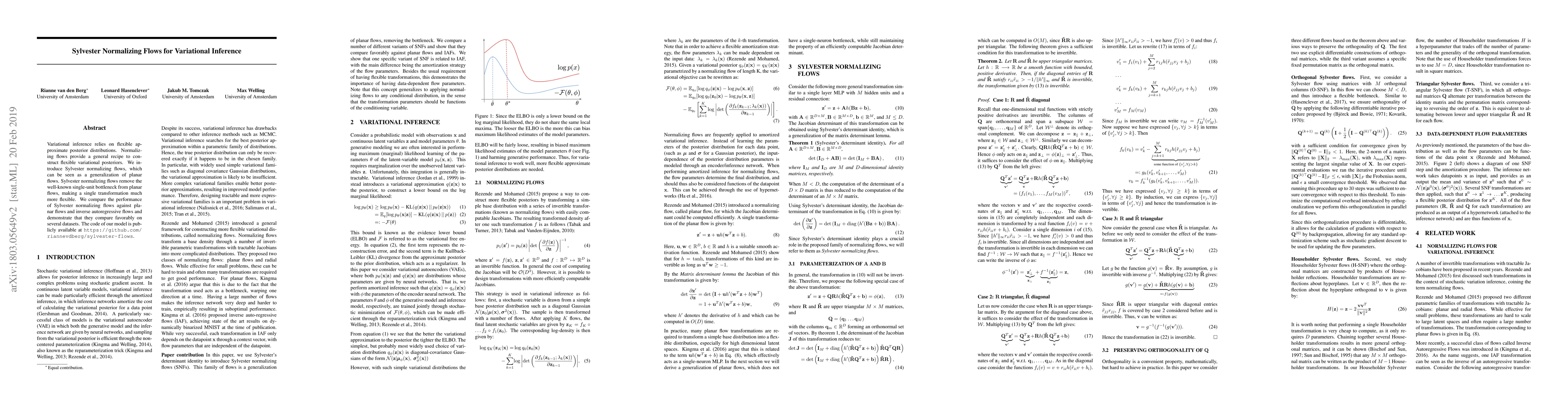 This paper introduces Sylvester normalizing flows, a generalization of planar flows that eliminates the bottleneck of single-unit transformations, enhancing flexibility. The authors demonstrate that Sylvester flows outperform planar and inverse autoregressive flows on various datasets.