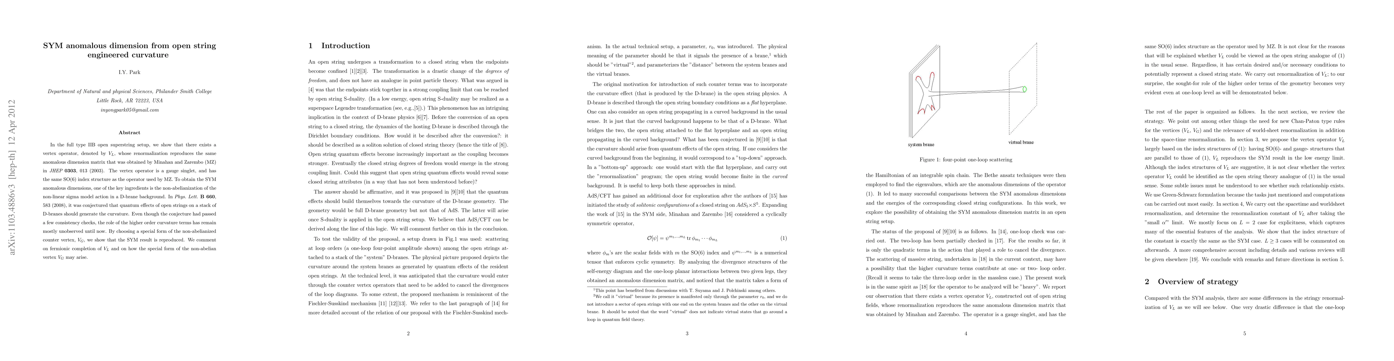 In the full type IIB open superstring setup, we show that there exists a vertex operator, denoted by $V_L$, whose renormalization reproduces the same anomalous dimension matrix that was obtained by Minahan and Zarembo (MZ) in {\em JHEP} {\bf 0303}, 013 (2003). The vertex operator is a gauge singlet, and has the same SO(6) index structure as the operator used by MZ. To obtain the SYM anomalous dimensions, one of the key ingredients is the non-abelianization of the non-linear sigma model action in a D-brane background. In {\em Phys.\ Lett.} {\bf B 660}, 583 (2008), it was conjectured that quantum effects of open strings on a stack of D-branes should generate the curvature. Even though the conjecture had passed a few consistency checks, the role of the higher order curvature terms has remain mostly unobserved until now. By choosing a special form of the non-abelianized counter vertex, $V_G$, we show that the SYM result is reproduced. We comment on fermionic completion of $V_L$ and on how the special form of the non-abelian vertex $V_G$ may arise.