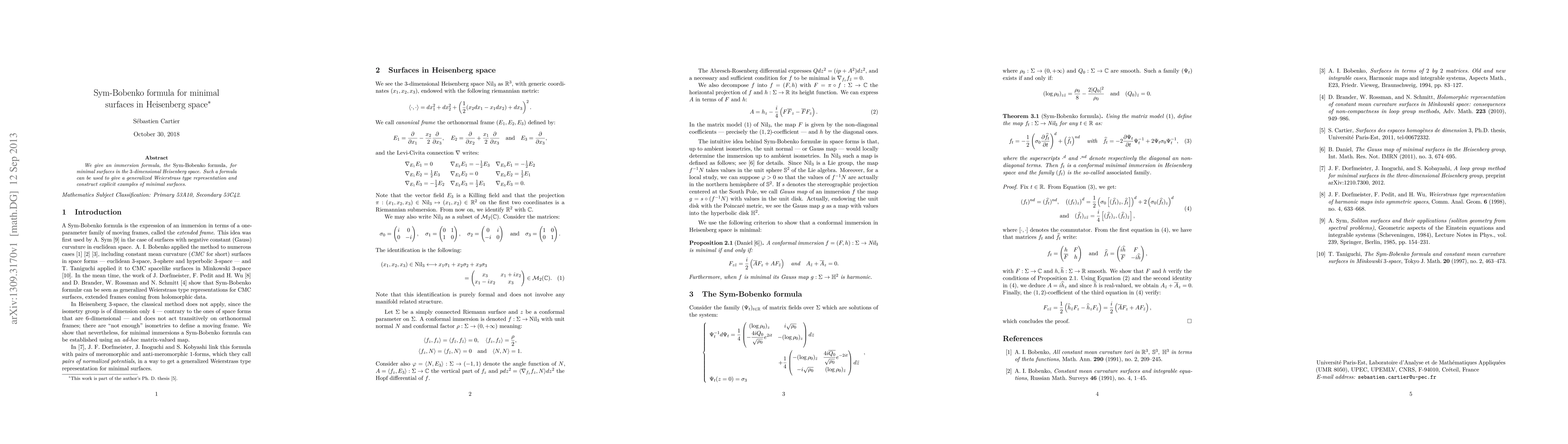 Summary: The Sym-Bobenko formula provides an immersion method for minimal surfaces in 3-dimensional Heisenberg space, enabling a generalized Weierstrass representation and explicit construction of such surfaces.