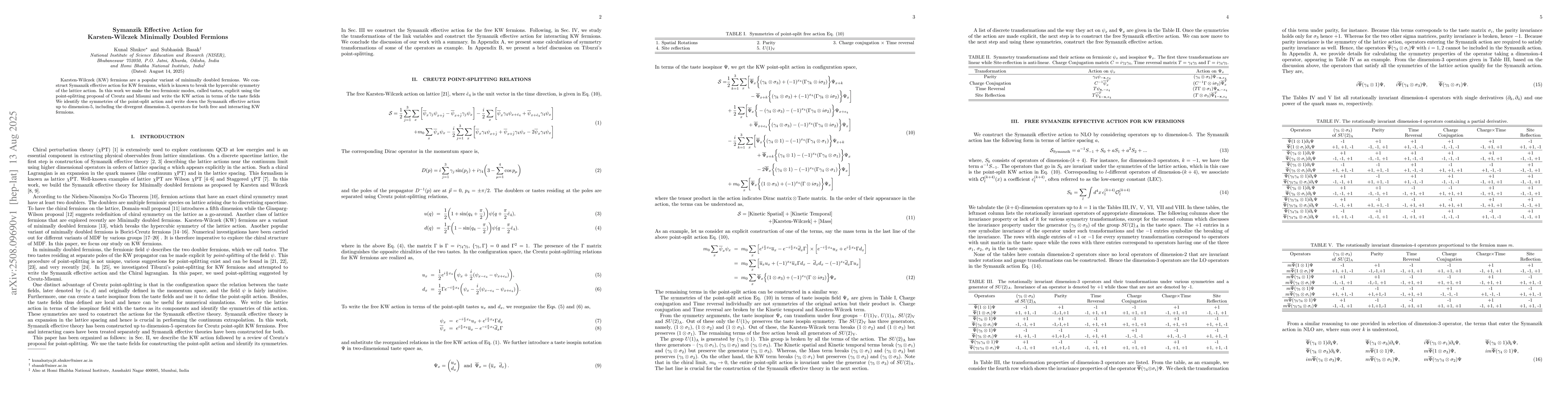 Karsten-Wilczek (KW) fermions are a popular variant of minimally doubled fermions. We construct Symanzik effective action for KW fermions, which is known to break the hypercubic symmetry of the lattice action. In this work we make the two fermionic modes, called tastes, explicit using the point-splitting proposal of Creutz and Misumi and write the KW action in terms of the taste fields. We identify the symmetries of the point-split action and write down the Symanzik effective action up to dimension-5, including the divergent dimension-3, operators for both free and interacting KW fermions.