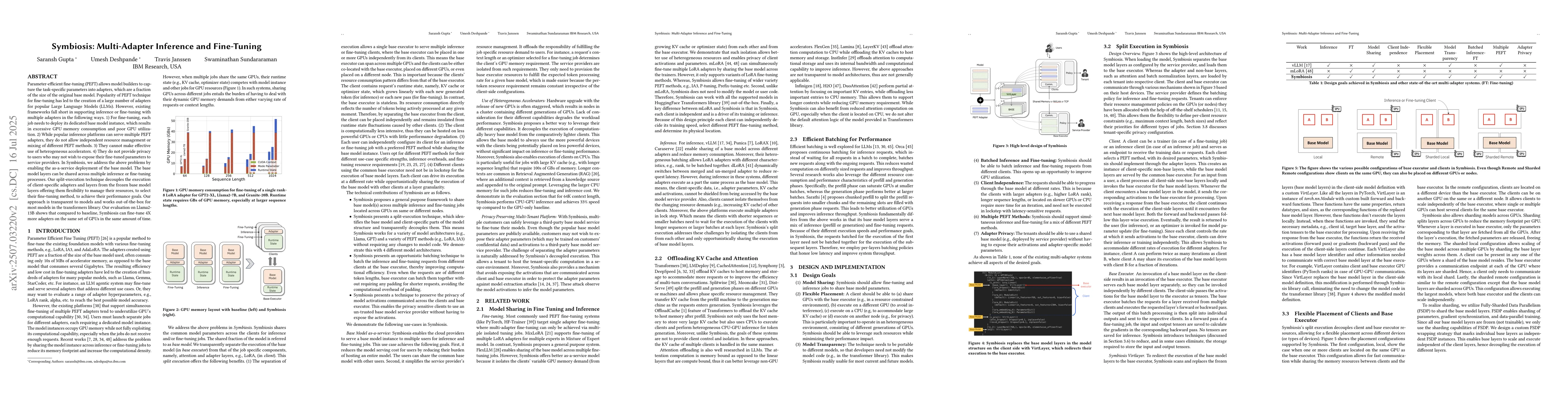 Parameter-efficient fine-tuning (PEFT) allows model builders to capture the task specific parameters into adapters, which are a fraction of the size of the original base model. Popularity of PEFT technique for fine-tuning has led to creation of a large number of adapters for popular Large Language Models (LLMs). However, existing frameworks fall short in supporting inference or fine-tuning with multiple adapters in the following ways. 1) For fine-tuning, each job needs to deploy its dedicated base model instance, which results in excessive GPU memory consumption and poor GPU utilization. 2) While popular inference platforms can serve multiple PEFT adapters, they do not allow independent resource management or mixing of different PEFT methods. 3) They cannot share resources (such as base model instance) between inference and fine-tuning jobs. 4) They do not provide privacy to users who may not wish to expose their fine-tuned parameters to service providers. In Symbiosis, we address the above problems by enabling as-a-service deployment of base model. The base model layers can be shared across multiple inference or fine-tuning processes. Our split-execution technique decouples the execution of client-specific adapters and layers from the frozen base model layers offering them flexibility to manage their resources, to select their fine-tuning method, to achieve their performance goals. Our approach is transparent to models and works out-of-the-box for most models in the transformers library. Our evaluation on Llama2-13B shows the compared to baseline, Symbiosis can fine-tune 4X more adapters on the same set of GPUs in the same amount of time.