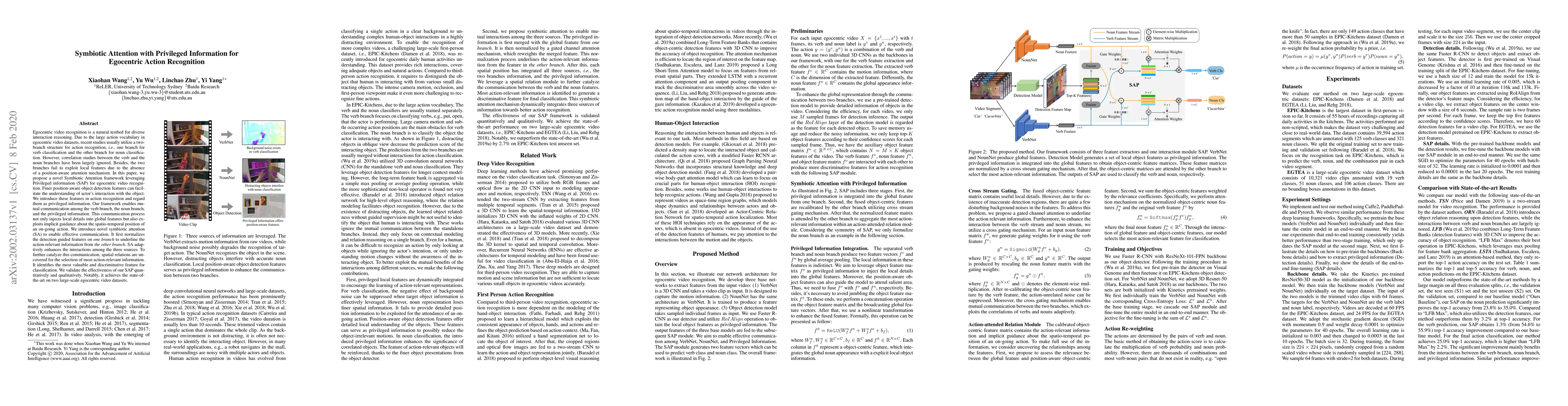 This paper proposes a Symbiotic Attention framework with Privileged Information (SAP) for egocentric action recognition, which leverages position-aware object detection features to enhance interaction understanding. The framework enables mutual communication among verb and noun branches and privileged information, adaptively enhancing interactions and identifying the most discriminative features for classification, achieving state-of-the-art results on two datasets.
