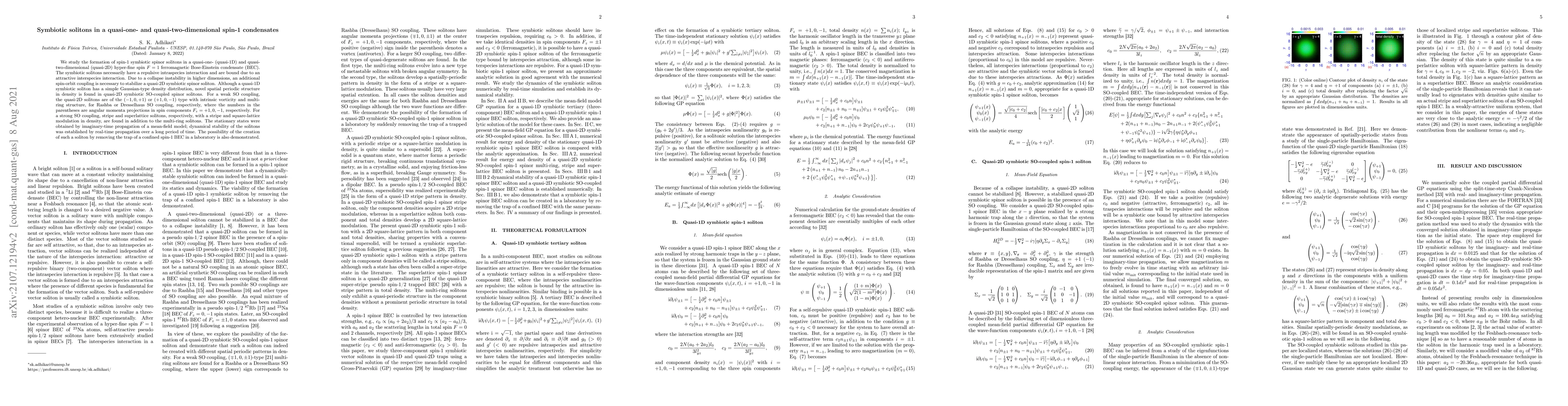 This paper investigates the formation and stability of symbiotic solitons in spin-1 ferromagnetic Bose-Einstein condensates in quasi-1D and quasi-2D geometries. It reveals complex spatial structures and stability mechanisms, including the necessity of spin-orbit coupling to stabilize quasi-2D solitons and the emergence of novel density patterns in the presence of such coupling.