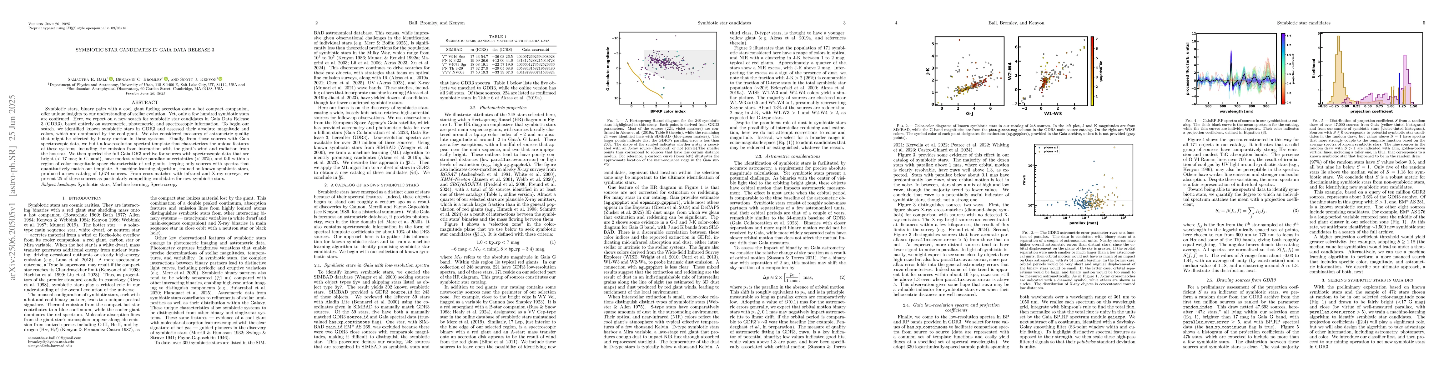 Symbiotic stars, binary pairs with a cool giant fueling accretion onto a hot compact companion, offer unique insights to our understanding of stellar evolution. Yet, only a few hundred symbiotic stars are confirmed. Here, we report on a new search for symbiotic star candidates in Gaia Data Release 3 (GDR3), based entirely on the archive's astrometric, photometric, and spectroscopic information. To begin our search, we identified known symbiotic stars in GDR3 and assessed their absolute magnitude and colors, which are dominated by the cool giant. We also considered measures of astrometric quality that might be affected by binary motion in these systems. Finally, from those sources with Gaia spectroscopic data, we built a low-resolution spectral template that characterizes the unique features of these systems, including H$\alpha$ emission from interaction with the giant's wind and radiation from the hot star. We then queried the full GDR3 archive for sources with spectroscopic data that are bright (< 17 mag in G-band), have modest relative parallax uncertainties (< 20%), and fall within a region of color-magnitude space characteristic of red giants, keeping only sources with spectra that quantitatively match our template. A machine-learning algorithm, trained on known symbiotic stars, produced a new catalog of 1,674 sources. From cross-matches with infrared and X-ray surveys, we present 25 of these sources as particularly compelling candidates for new symbiotic stars.