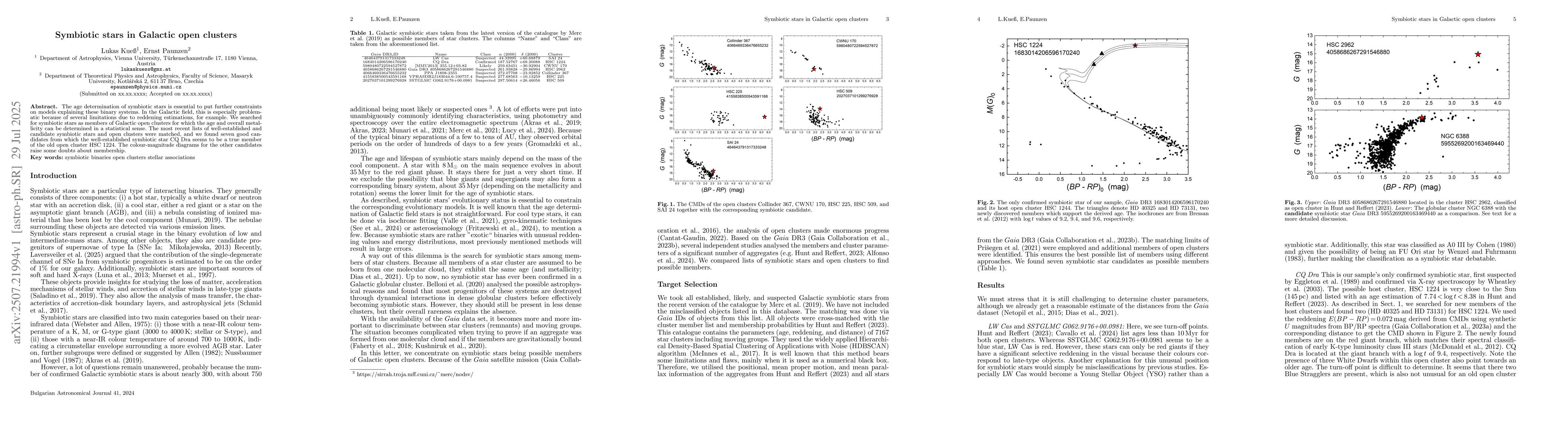 The age determination of symbiotic stars is essential to put further constraints on models explaining these binary systems. In the Galactic field, this is especially problematic because of several limitations due to reddening estimations, for example. We searched for symbiotic stars as members of Galactic open clusters for which the age and overall metallicity can be determined in a statistical sense. The most recent lists of well-established and candidate symbiotic stars and open clusters were matched, and we found seven good candidates from which the well-established symbiotic star CQ Dra seems to be a true member of the old open cluster HSC 1224. The colour-magnitude diagrams for the other candidates raise some doubts about membership.