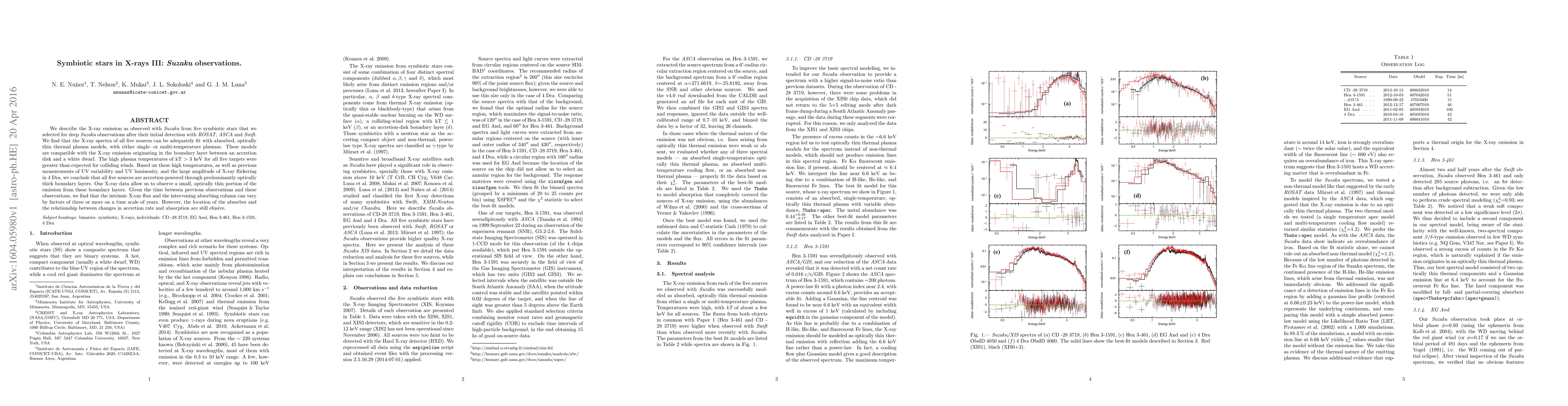 This study, using Suzaku observations, finds that X-ray emission from five symbiotic stars can be explained by optically thin thermal plasma models, indicating accretion-powered sources with hot boundary layers between accretion disks and white dwarfs. The research reveals variability in intrinsic X-ray flux and absorbing column over years, though the cause remains unclear.