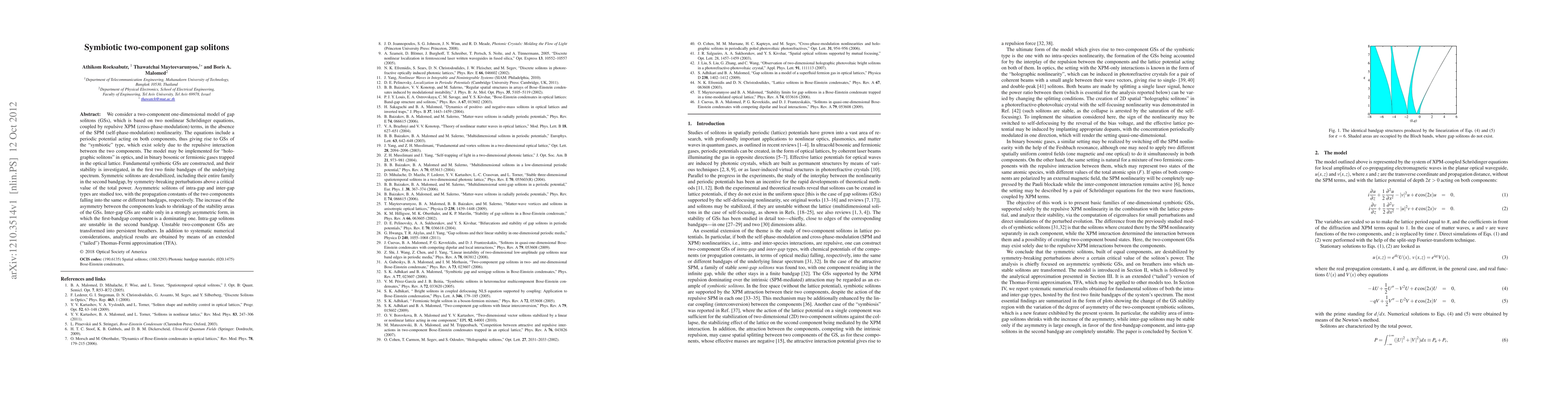 We consider a two-component one-dimensional model of gap solitons (GSs), which is based on two nonlinear Schr\"odinger equations, coupled by repulsive XPM (cross-phase-modulation) terms, in the absence of the SPM (self-phase-modulation) nonlinearity. The equations include a periodic potential acting on both components, thus giving rise to GSs of the "symbiotic" type, which exist solely due to the repulsive interaction between the two components. The model may be implemented for "holographic solitons" in optics, and in binary bosonic or fermionic gases trapped in the optical lattice. Fundamental symbiotic GSs are constructed, and their stability is investigated, in the first two finite bandgaps of the underlying spectrum. Symmetric solitons are destabilized, including their entire family in the second bandgap, by symmetry-breaking perturbations above a critical value of the total power. Asymmetric solitons of intra-gap and inter-gap types are studied too, with the propagation constants of the two components falling into the same or different bandgaps, respectively. The increase of the asymmetry between the components leads to shrinkage of the stability areas of the GSs. Inter-gap GSs are stable only in a strongly asymmetric form, in which the first-bandgap component is a dominating one. Intra-gap solitons are unstable in the second bandgap. Unstable two-component GSs are transformed into persistent breathers. In addition to systematic numerical considerations, analytical results are obtained by means of an extended ("tailed") Thomas-Fermi approximation (TFA).