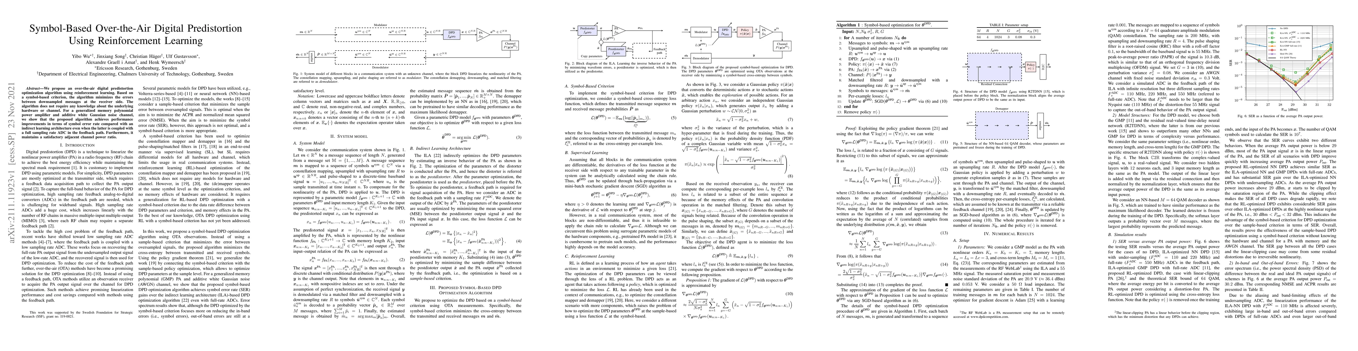 This paper proposes a reinforcement learning-based digital predistortion algorithm that optimizes over-the-air signal transmission by minimizing symbol error rates, without requiring hardware or channel knowledge. The method demonstrates superior performance and maintains a good adjacent channel power ratio compared to indirect learning approaches.