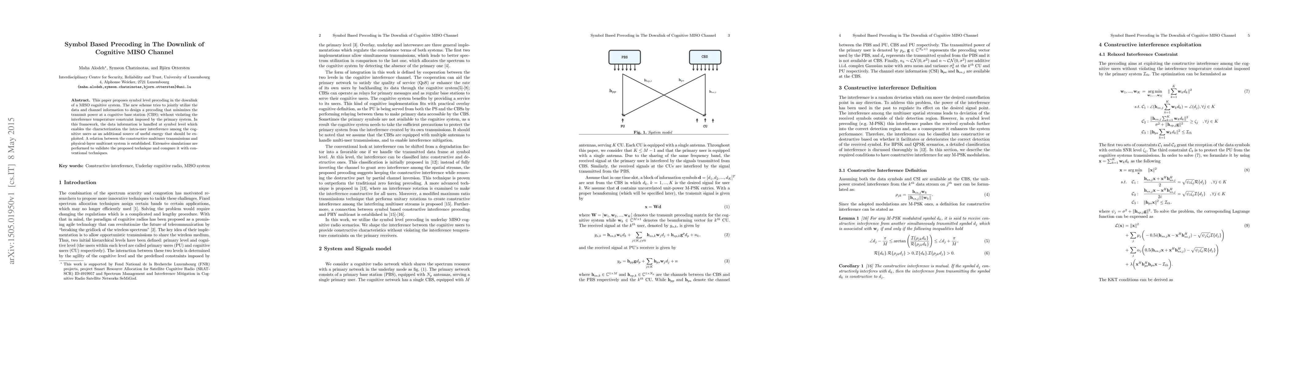 The proposed symbol-level precoding technique enables constructive interference exploitation among cognitive multi-user transmissions while minimizing primary user interference.
