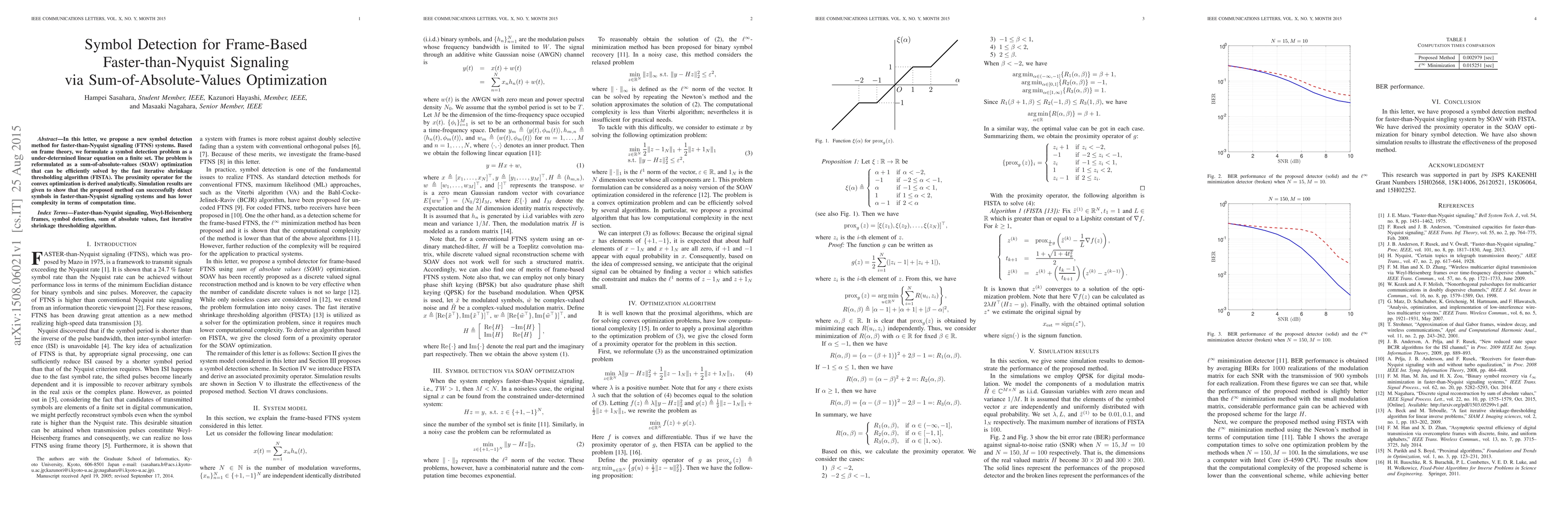 This paper proposes a new symbol detection method for faster-than-Nyquist signaling (FTNS) systems using sum-of-absolute-values optimization. The method leverages frame theory and efficiently solves the detection problem via the fast iterative shrinkage thresholding algorithm (FISTA).
