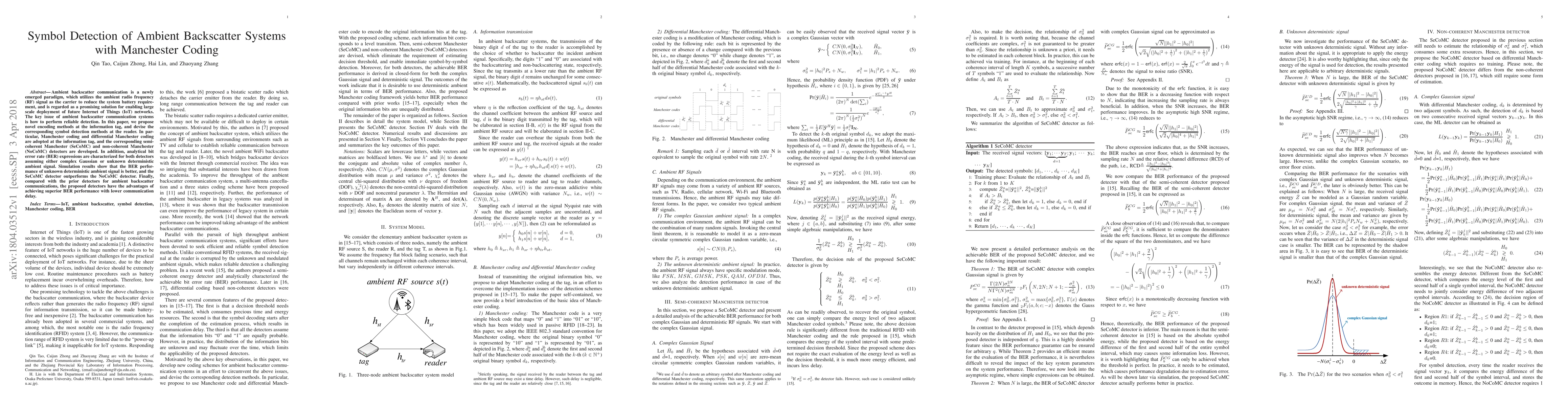 Ambient backscatter communication is a newly emerged paradigm, which utilizes the ambient radio frequency (RF) signal as the carrier to reduce the system battery requirement, and is regarded as a promising solution for enabling large scale deployment of future Internet of Things (IoT) networks. The key issue of ambient backscatter communication systems is how to perform reliable detection. In this paper, we propose novel encoding methods at the information tag, and devise the corresponding symbol detection methods at the reader. In particular, Manchester coding and differential Manchester coding are adopted at the information tag, and the corresponding semi-coherent Manchester (SeCoMC) and non-coherent Manchester (NoCoMC) detectors are developed. In addition, analytical bit error rate (BER) expressions are characterized for both detectors assuming either complex Gaussian or unknown deterministic ambient signal. Simulation results show that the BER performance of unknown deterministic ambient signal is better, and the SeCoMC detector outperforms the NoCoMC detector. Finally, compared with the prior detectors for ambient backscatter communications, the proposed detectors have the advantages of achieving superior BER performance with lower communication delay.