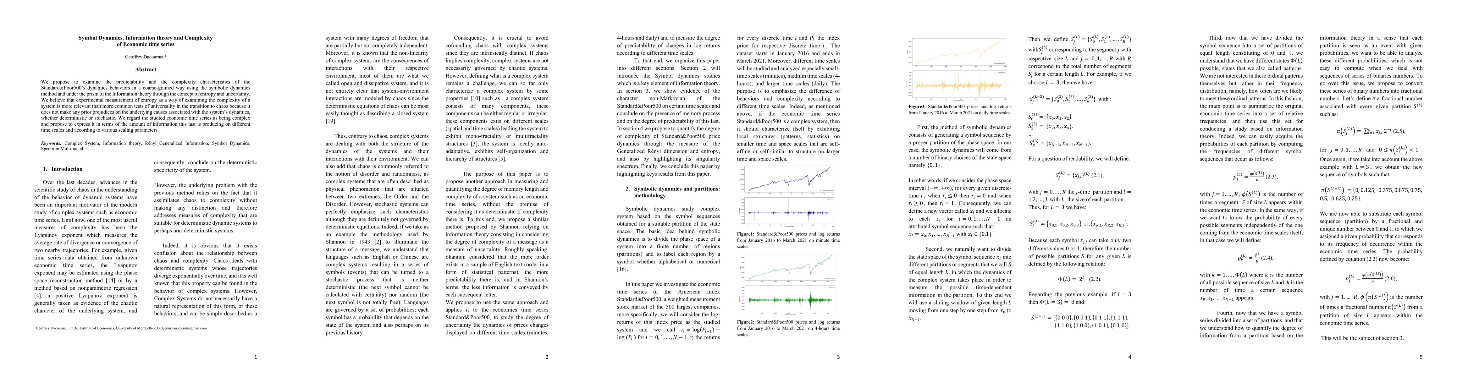 We propose to examine the predictability and the complexity characteristics of the Standard&Poor500 dynamics behaviors in a coarse-grained way using the symbolic dynamics method and under the prism of the Information theory through the concept of entropy and uncertainty. We believe that experimental measurement of entropy as a way of examining the complexity of a system is more relevant than more common tests of universality in the transition to chaos because it does not make any prior prejudices on the underlying causes associated with the system dynamics, whether deterministic or stochastic. We regard the studied economic time series as being complex and propose to express it in terms of the amount of information this last is producing on different time scales and according to various scaling parameters.