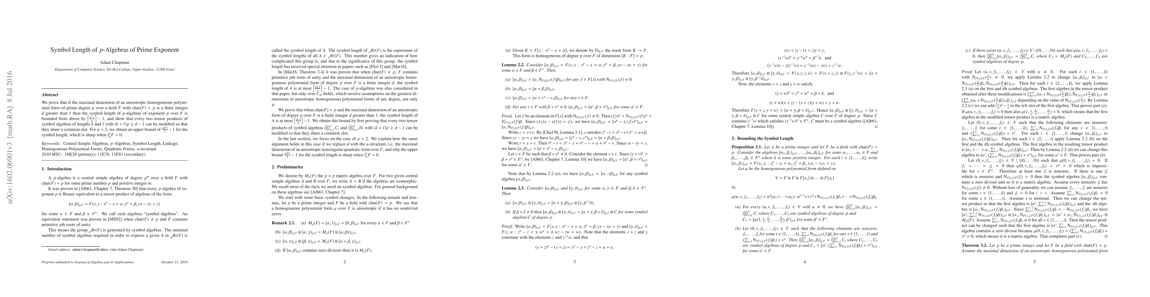 This paper establishes an upper bound for the symbol length of $p$-algebras of prime exponent over fields of characteristic $p$, showing that it is bounded by $\left \lceil \frac{d-1}{p} \right \rceil-1$ when $d$ is the maximal dimension of an anisotropic homogeneous polynomial form of degree $p$. It also demonstrates that tensor products of symbol algebras can be modified to share a common slot under certain conditions.