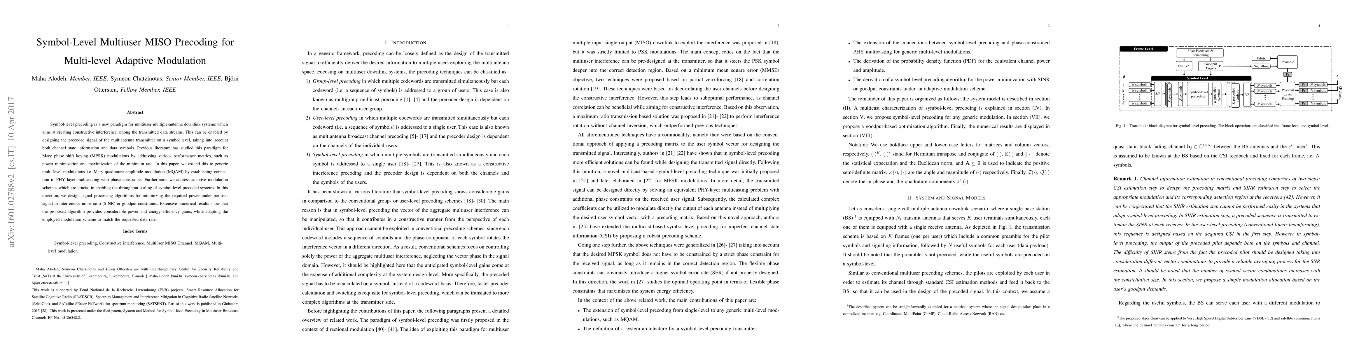 This paper proposes a symbol-level precoding method for multiuser MISO systems with multi-level modulations, achieving constructive interference and adaptive modulation for throughput scaling. The designed algorithms minimize power under SINR or goodput constraints, demonstrating significant power and energy efficiency improvements.