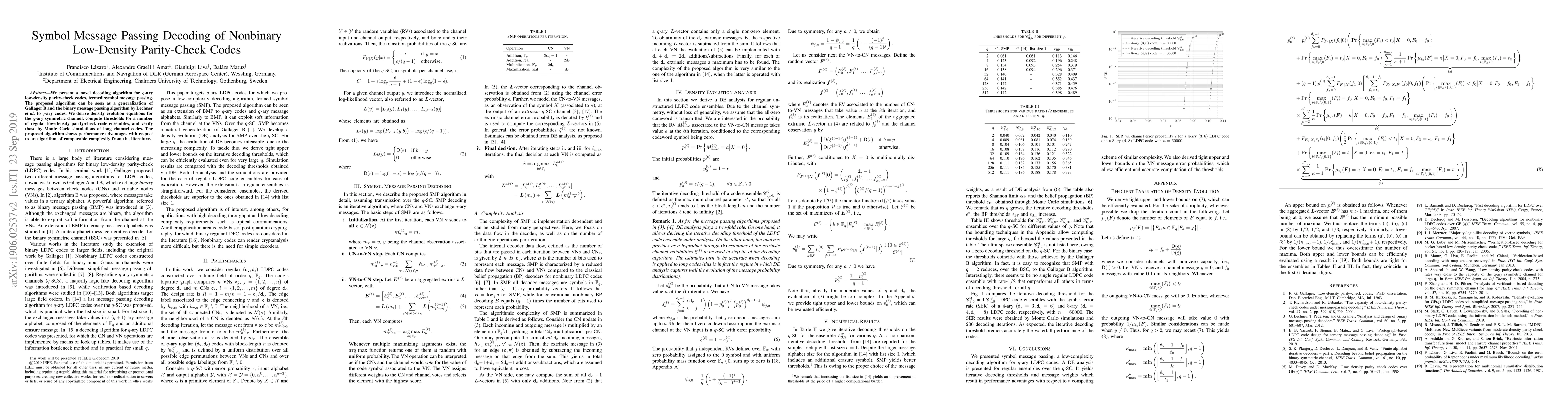 This paper introduces a novel symbol message passing decoding algorithm for q-ary low-density parity-check codes, generalizing existing binary algorithms. The authors derive density evolution equations and demonstrate performance improvements over comparable algorithms through Monte Carlo simulations.