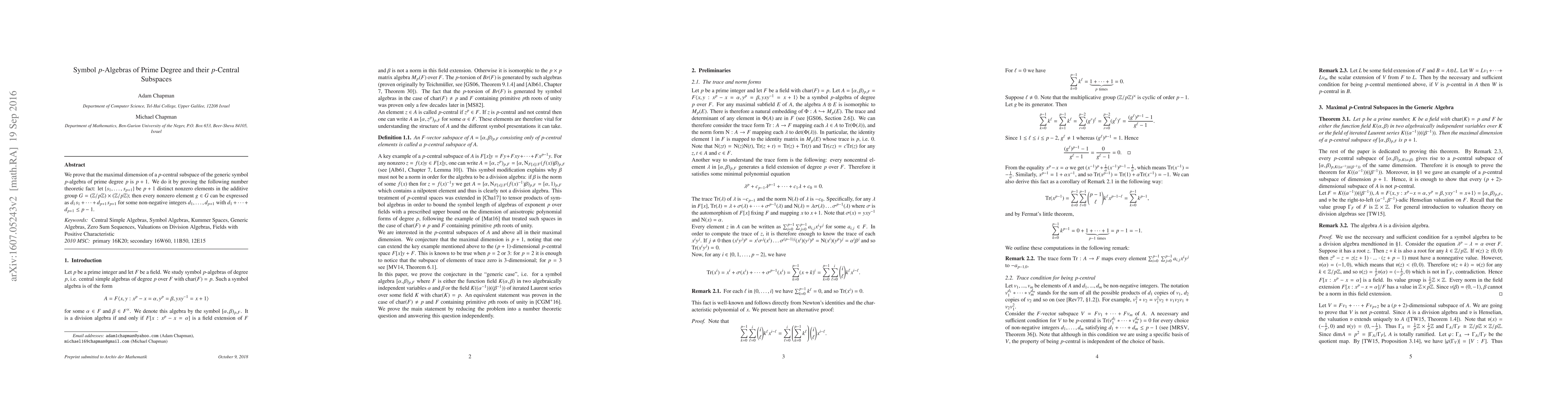 We prove that the maximal dimension of a $p$-central subspace of the generic symbol $p$-algebra of prime degree $p$ is $p+1$. We do it by proving the following number theoretic fact: let $\{s_1,\dots,s_{p+1}\}$ be $p+1$ distinct nonzero elements in the additive group $G=(\mathbb{Z}/p \mathbb{Z}) \times (\mathbb{Z}/p \mathbb{Z})$; then every nonzero element $g \in G$ can be expressed as $d_1 s_1+\dots+d_{p+1} s_{p+1}$ for some non-negative integers $d_1,\dots,d_{p+1}$ with $d_1+\dots+d_{p+1} \leq p-1$.
