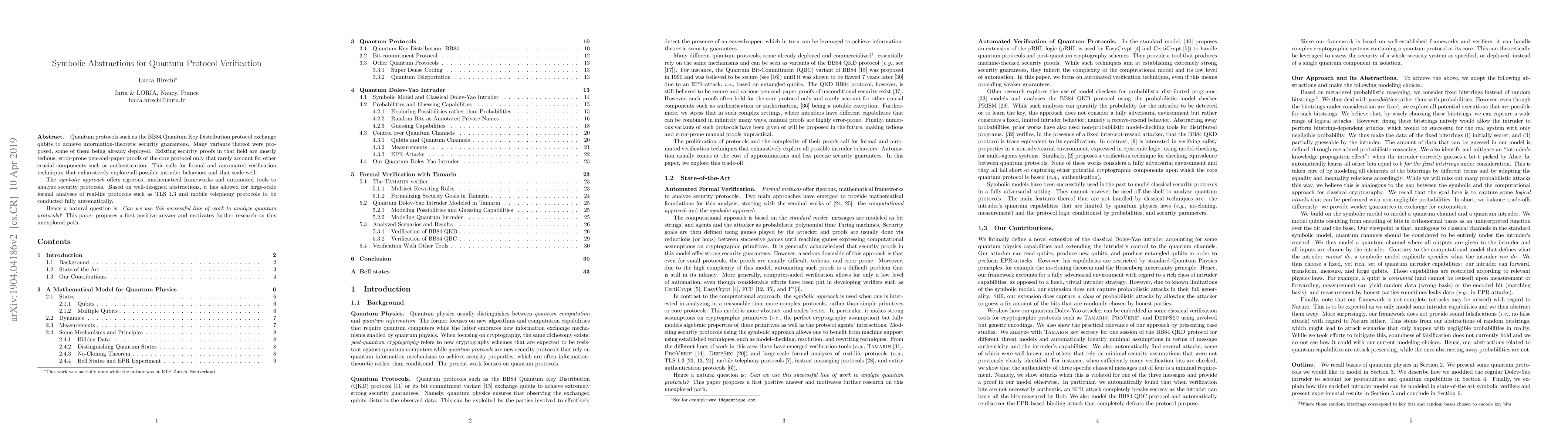 Quantum protocols such as the BB84 Quantum Key Distribution protocol exchange qubits to achieve information-theoretic security guarantees. Many variants thereof were proposed, some of them being already deployed. Existing security proofs in that field are mostly tedious, error-prone pen-and-paper proofs of the core protocol only that rarely account for other crucial components such as authentication. This calls for formal and automated verification techniques that exhaustively explore all possible intruder behaviors and that scale well. The symbolic approach offers rigorous, mathematical frameworks and automated tools to analyze security protocols. Based on well-designed abstractions, it has allowed for large-scale formal analyses of real-life protocols such as TLS 1.3 and mobile telephony protocols. Hence a natural question is: Can we use this successful line of work to analyze quantum protocols? This paper proposes a first positive answer and motivates further research on this unexplored path.