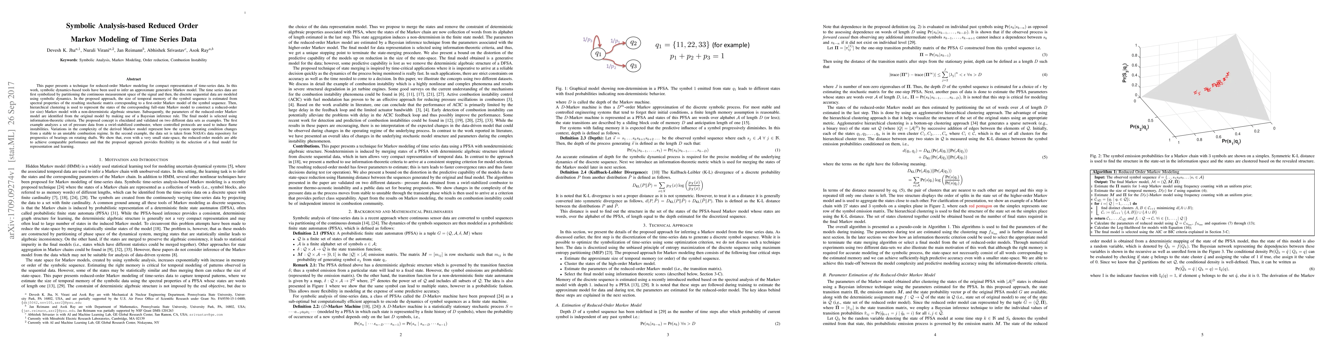 This paper presents a technique for reduced-order Markov modeling for compact representation of time-series data. In this work, symbolic dynamics-based tools have been used to infer an approximate generative Markov model. The time-series data are first symbolized by partitioning the continuous measurement space of the signal and then, the discrete sequential data are modeled using symbolic dynamics. In the proposed approach, the size of temporal memory of the symbol sequence is estimated from spectral properties of the resulting stochastic matrix corresponding to a first-order Markov model of the symbol sequence. Then, hierarchical clustering is used to represent the states of the corresponding full-state Markov model to construct a reduced-order or size Markov model with a non-deterministic algebraic structure. Subsequently, the parameters of the reduced-order Markov model are identified from the original model by making use of a Bayesian inference rule. The final model is selected using information-theoretic criteria. The proposed concept is elucidated and validated on two different data sets as examples. The first example analyzes a set of pressure data from a swirl-stabilized combustor, where controlled protocols are used to induce flame instabilities. Variations in the complexity of the derived Markov model represent how the system operating condition changes from a stable to an unstable combustion regime. In the second example, the data set is taken from NASA's data repository for prognostics of bearings on rotating shafts. We show that, even with a very small state-space, the reduced-order models are able to achieve comparable performance and that the proposed approach provides flexibility in the selection of a final model for representation and learning.