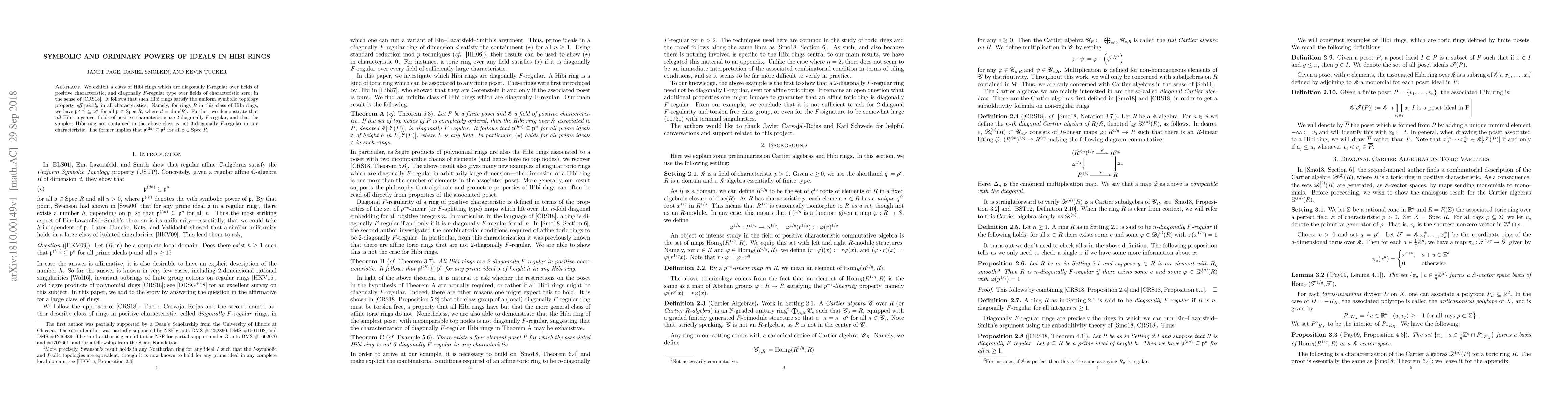 This paper explores the symbolic and ordinary powers of ideals in Hibi rings, demonstrating that certain Hibi rings exhibit uniform symbolic topology properties across all characteristics. It shows that these rings satisfy $P^{(dn)} \subseteq P^n$ for all prime ideals $P$, where $d$ is the dimension of the ring, and highlights that Hibi rings over positive characteristic fields are 2-diagonally $F$-regular.