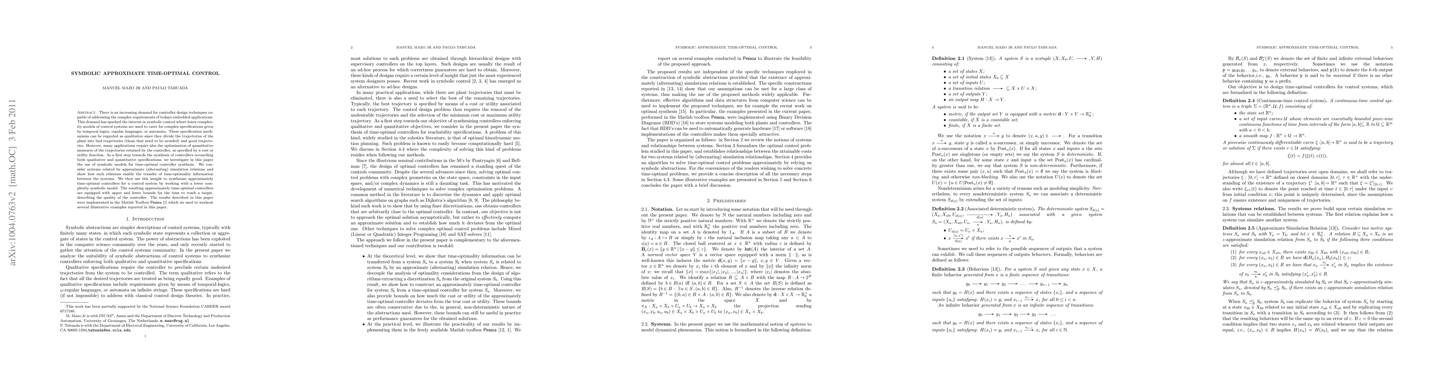 This paper explores symbolic control for synthesizing time-optimal controllers that balance qualitative and quantitative specifications. It leverages approximate simulation relations to transfer time-optimality information between systems, enabling the design of controllers with bounds on time performance, implemented in the Matlab Toolbox Pessoa.
