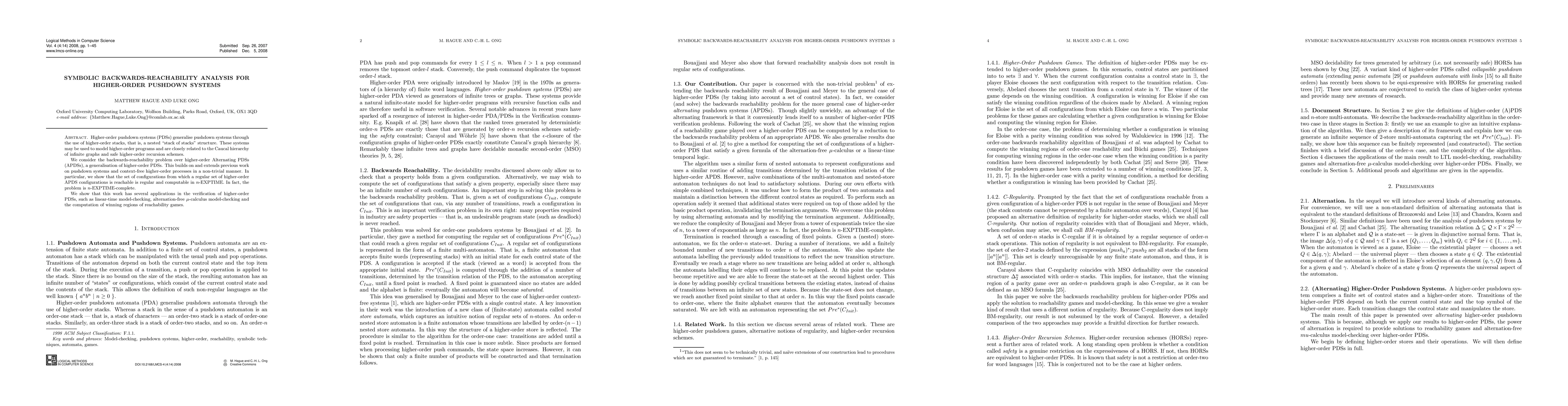 This paper presents a symbolic backwards-reachability analysis for higher-order pushdown systems, demonstrating that the problem is n-EXPTIME-complete and has applications in verifying higher-order PDSs, including model-checking and reachability games.